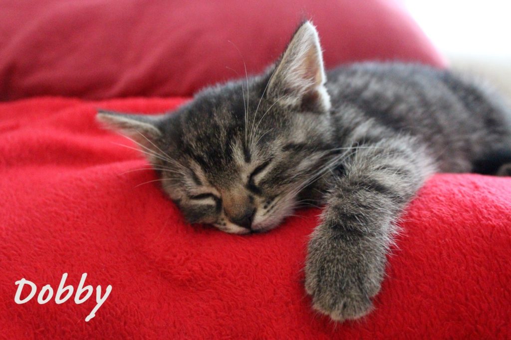 Mourovatý kocourek, který byl se svým bráškou Tobbym nalezen v obci Obříství. Jako jedni z mála příjmů vypadají zcela zdravě. Depozitářka Markétka o kocourkovi informuje: Dobby je průzkumník a horolezec. Na co se dá vyšplhat, to pokoří! Nebojí se ničeho, ...