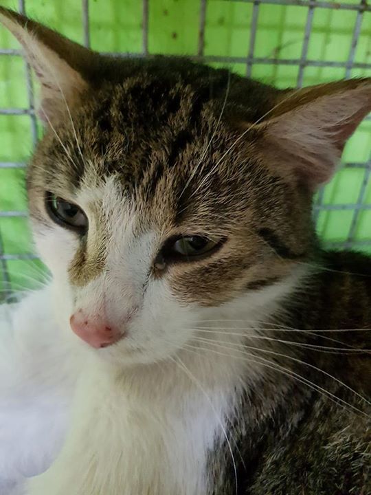 Bílomourovatý kocourek, narozený cca 1.5.2016 se přidal k pánovi, který šel z obce Vesce do Rovného. Kocourek se nedal odehnat a zůstal u jejich domu dva dny než ho pán přinesl k nám do Sluníčka. Je to hodný kocourek, který si nyní užívá tepla útulku, je mazlivý, zatím hodný. Dostal jméno Vestík.