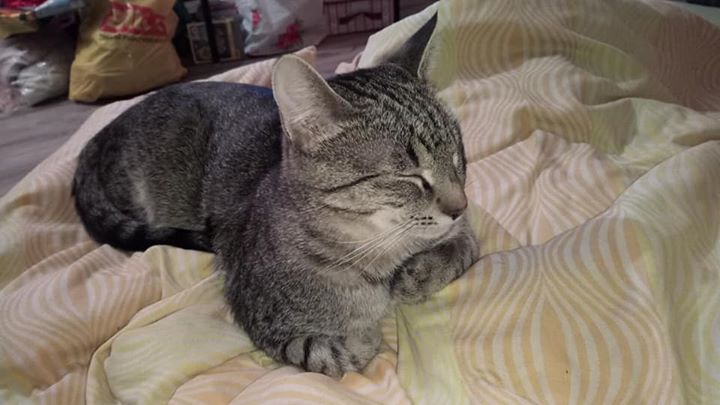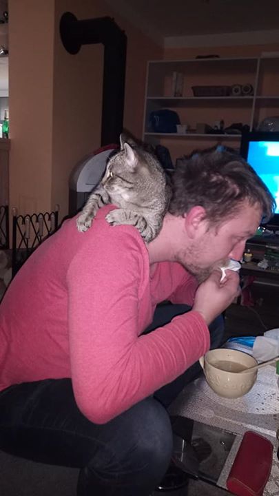 kocourkovi se daří dobře, rád řádí doma i venku a když je doma, tak se velmi rád mazlí svým specifickým způsobem. Když ležíme, tak si nejraději lehá na hrudník a když se chová v ruce, tak je nejšťastnější, když může být přes rameno = napůl na zádech a napůl v náručí, aby se mohl otírat hlavou o hlavu :o) Když byl menší, tak miloval skákání na záda, takže se k němu člověk nemohl moc otáčet zády a nebo v jeho blízkosti si kleknout nebo jít do dřepu :o)