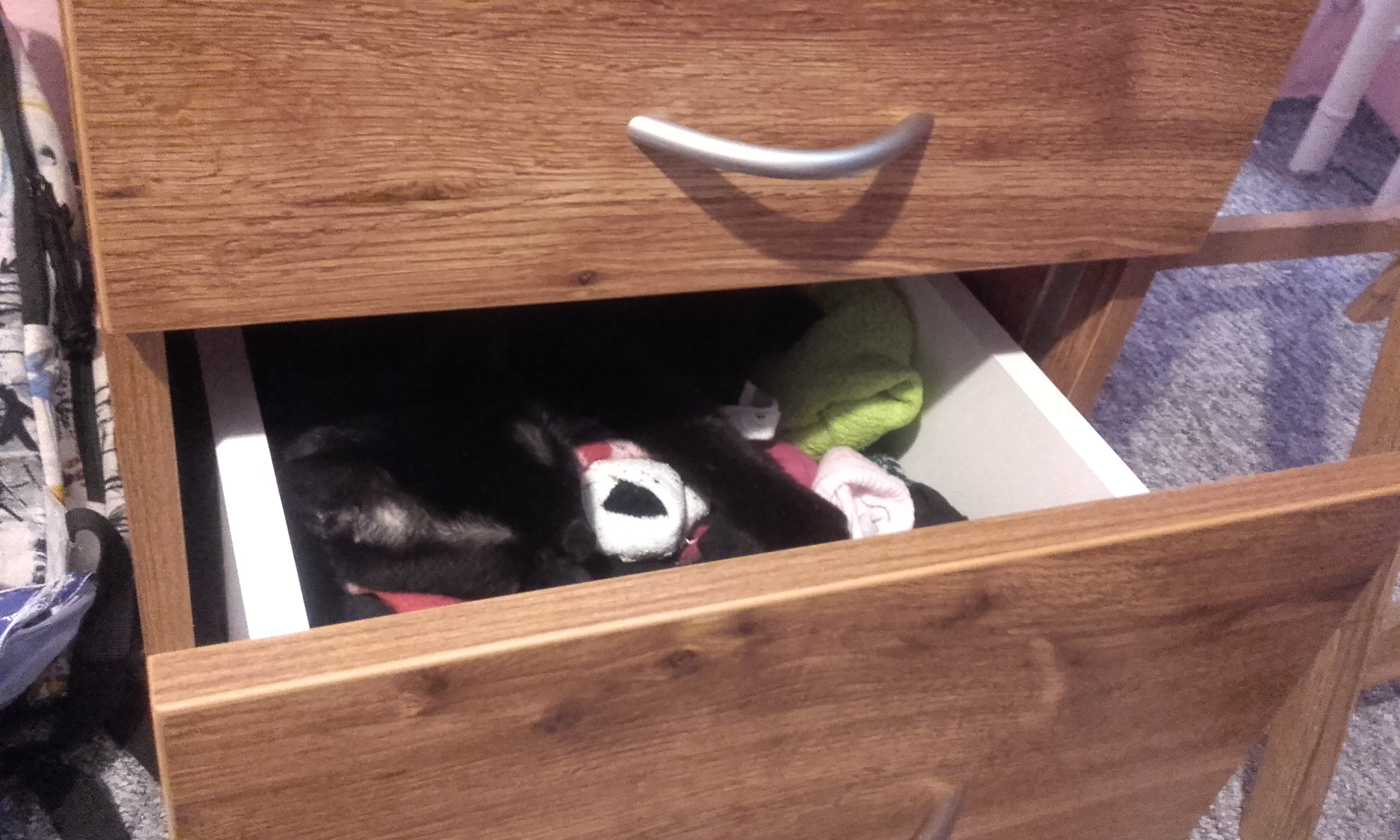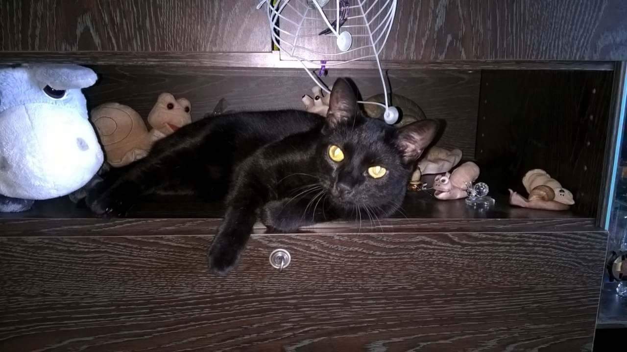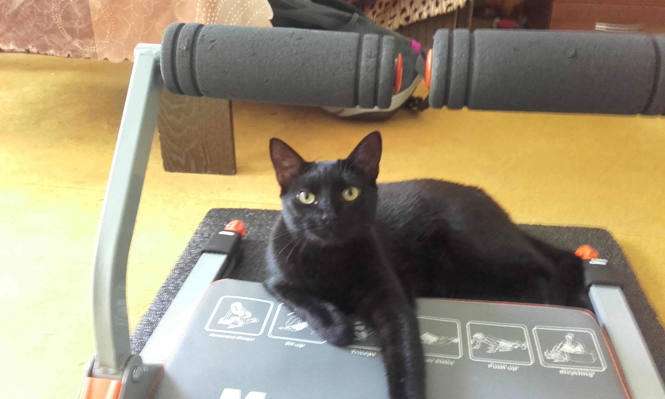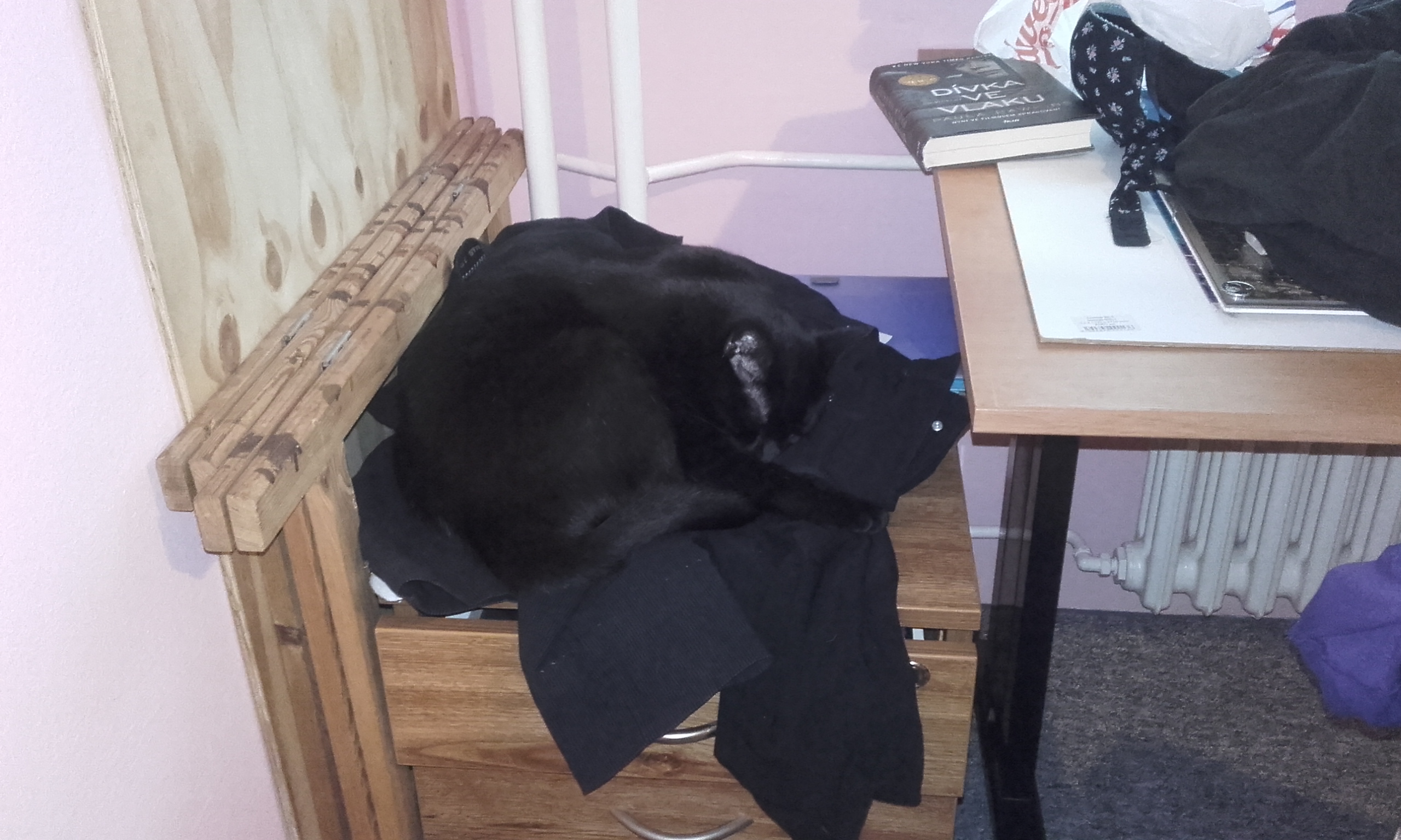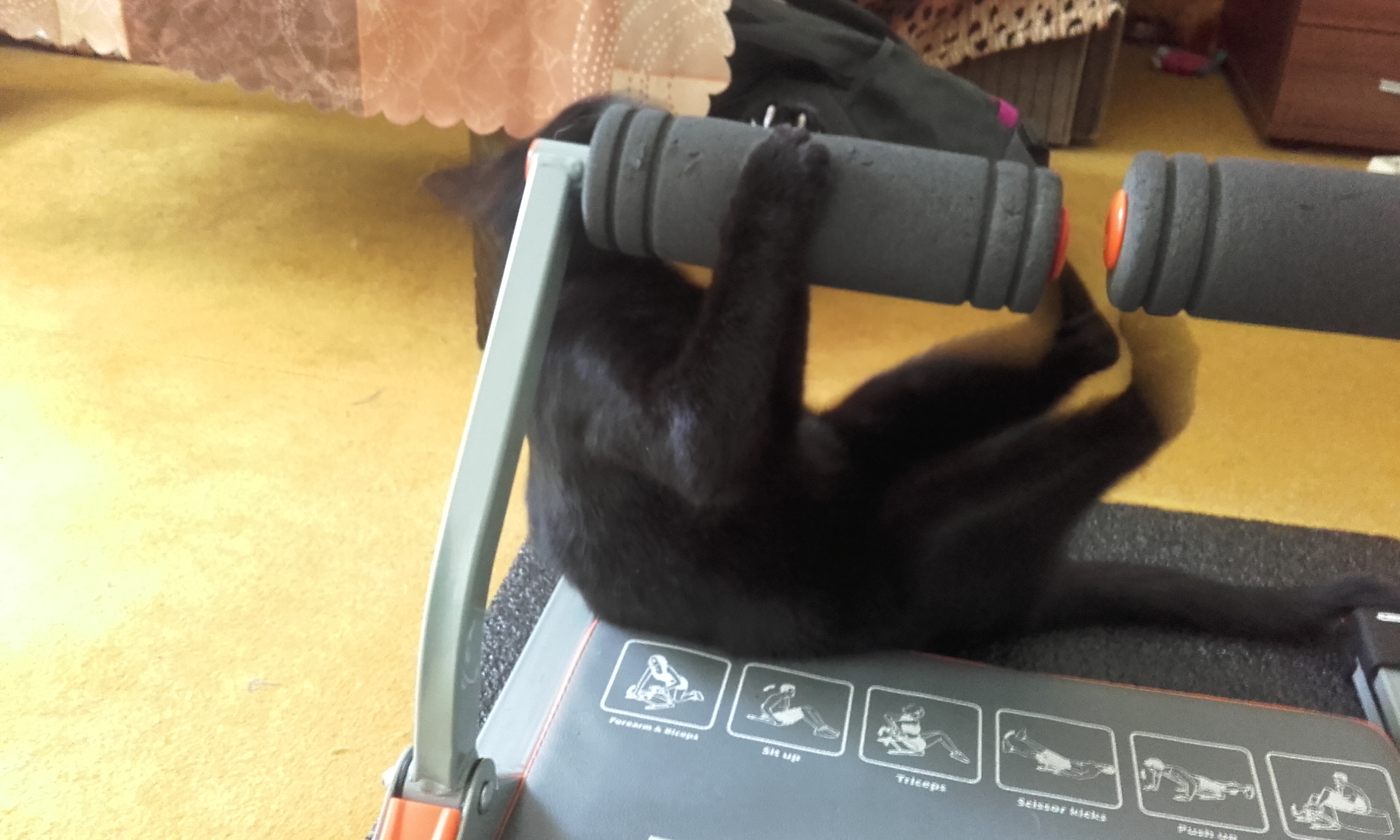 Na fotkách můžete vidět, že Bruncvík rád cvičí (popravdě cvičí častěji než já, což je pro mne hrůza :D), také rád otevírá šuplíky a pak si lehá do mých ponožek či do hor prádla a jelikož nosím převážně černou, nemůžu ho v té změti kolikrát ani najít. 😀 O skříních ani nemluvím, naštěstí moje šatní skříň při otevírání hodně vrže, tak se vždycky prozradí. 🙂