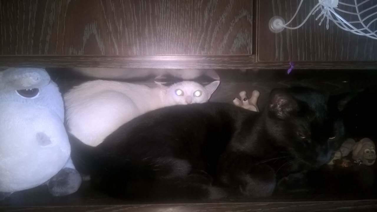 Bruncvík byl jistou dobu značně závislý na laserové rybičce, uměl si ji sám najít a poctivě si vymňoukávat, abychom mu svítili. Teď došly baterky, tak si oblíbil plyšové myšky a gumového pavouka 😀 Ten laser je snad závislost, jsem skoro ráda, že si Bruncvík hraje i s něčím jiným. 😀 A samozřejmě taky s naší druhou kočkou Pižmískem. Často si říkám, že je skoro výhoda, že nemá zoubky, aspoň z Pižmíka nelítá tolik chlupů. 😀 Umějí se honit a leckdy i rvát znamenitě, ale zase když přítel nebo já nějakou kočku omylem zavřeme v kuchyni, nebo na záchodě (je to mžik), tak ta druhá ji prozradí a mňouká, dokud tu druhou nevysvobodíme. 😀