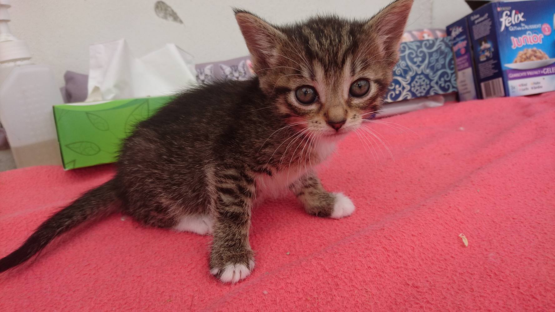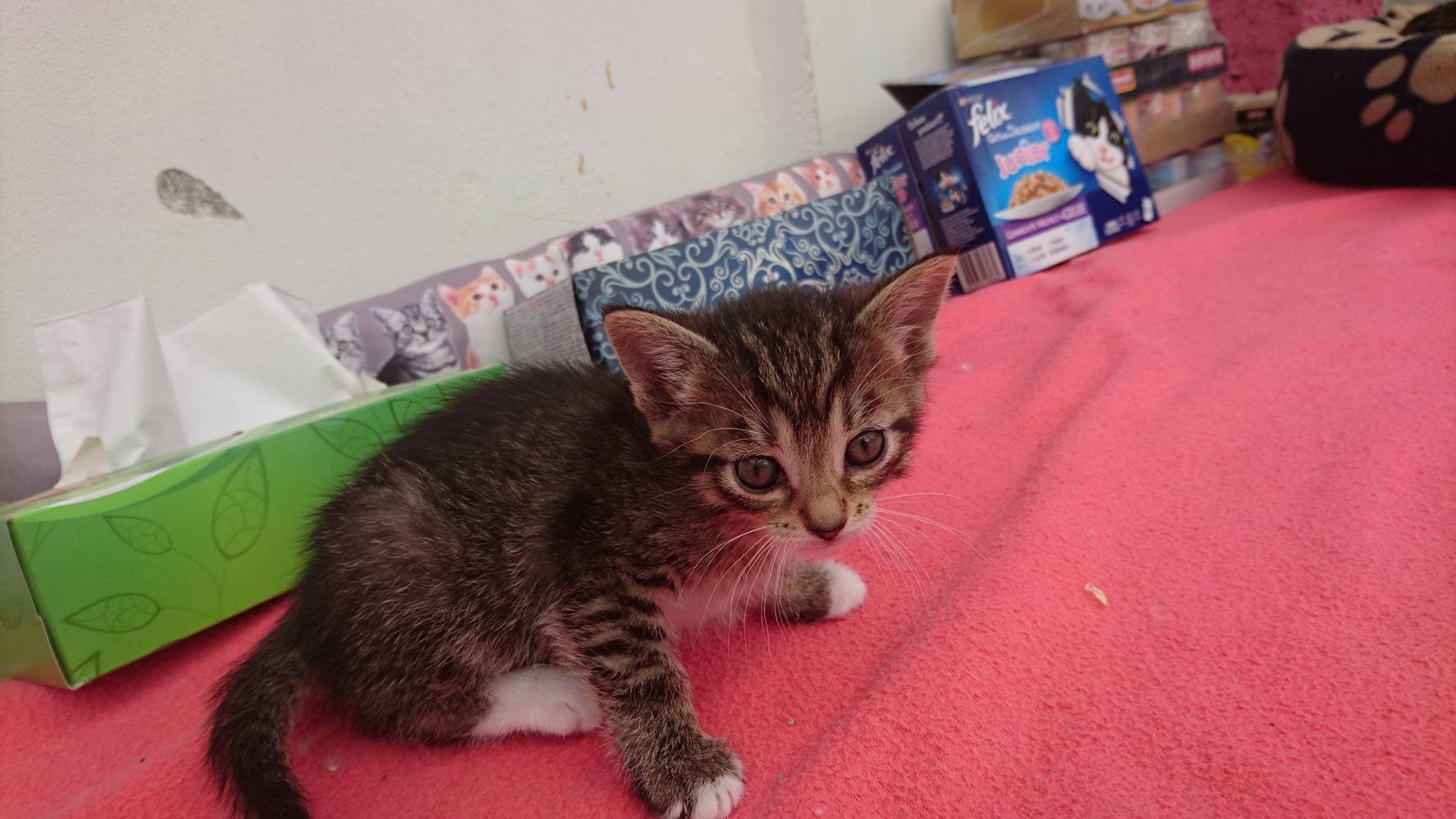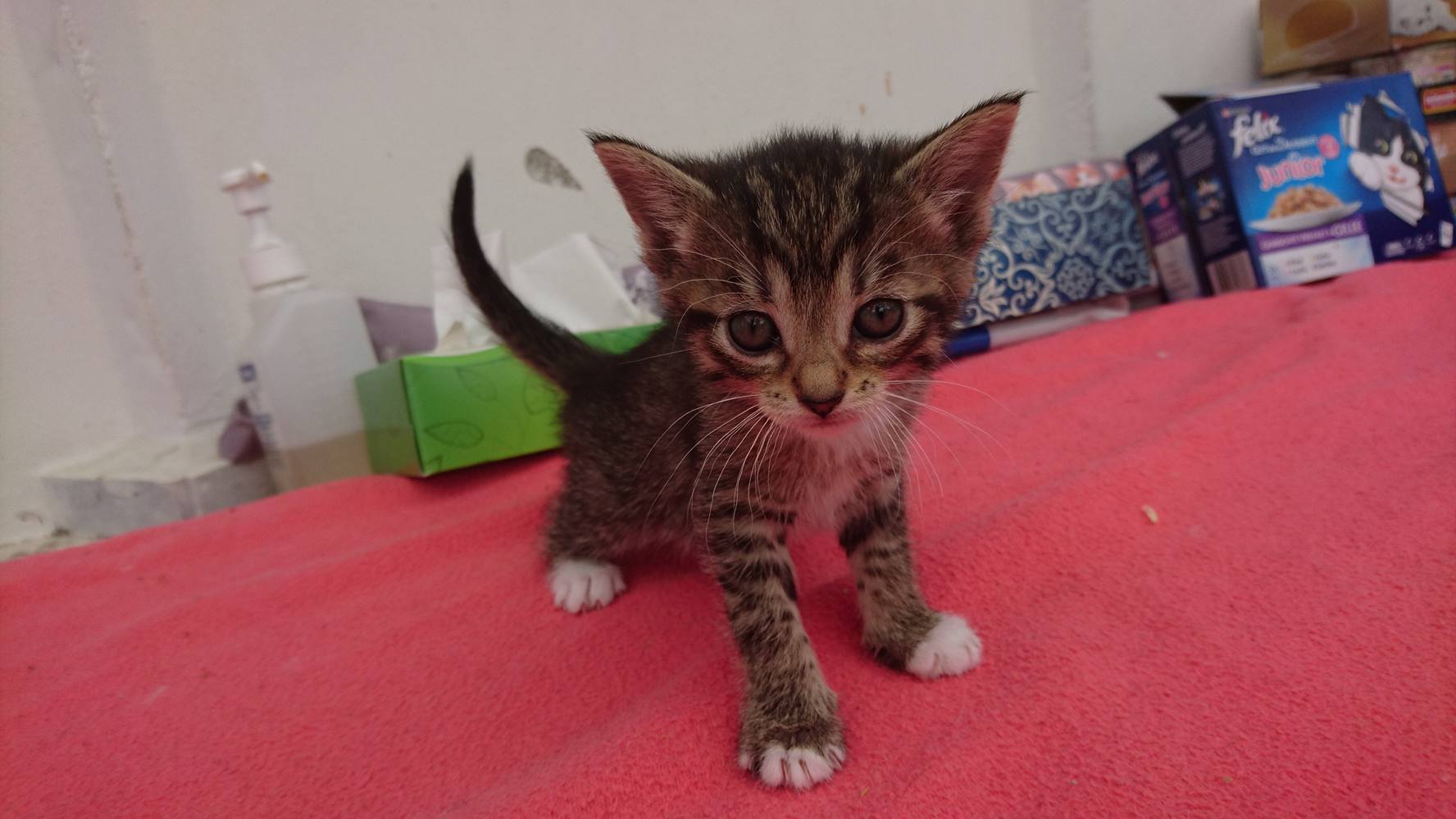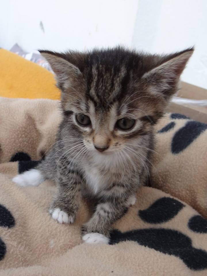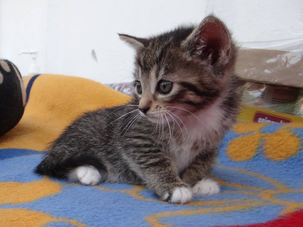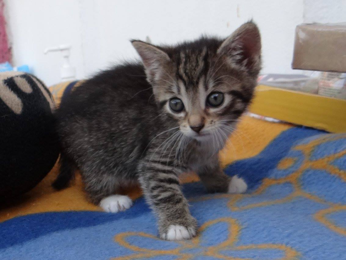 Mourovatá kočička s bílými ponožkami, kterou jsme přijali s maminku Tulinkou a dvěmi sestřičkami z města Terezín. Tamní radní a městská policie se snaží o kočičky bez domova postarat umístěním do útulku. Postupují správně dle zákona na ochranu zvířat a dle občasného zákona. Velice jim fandím a budu se snažit vyjít vstříc jak to jen půjde. Koťátka byla asi dvoudenní, ještě slepá s pupeční šňůrou.