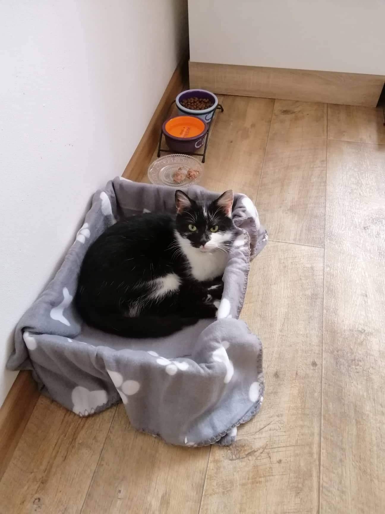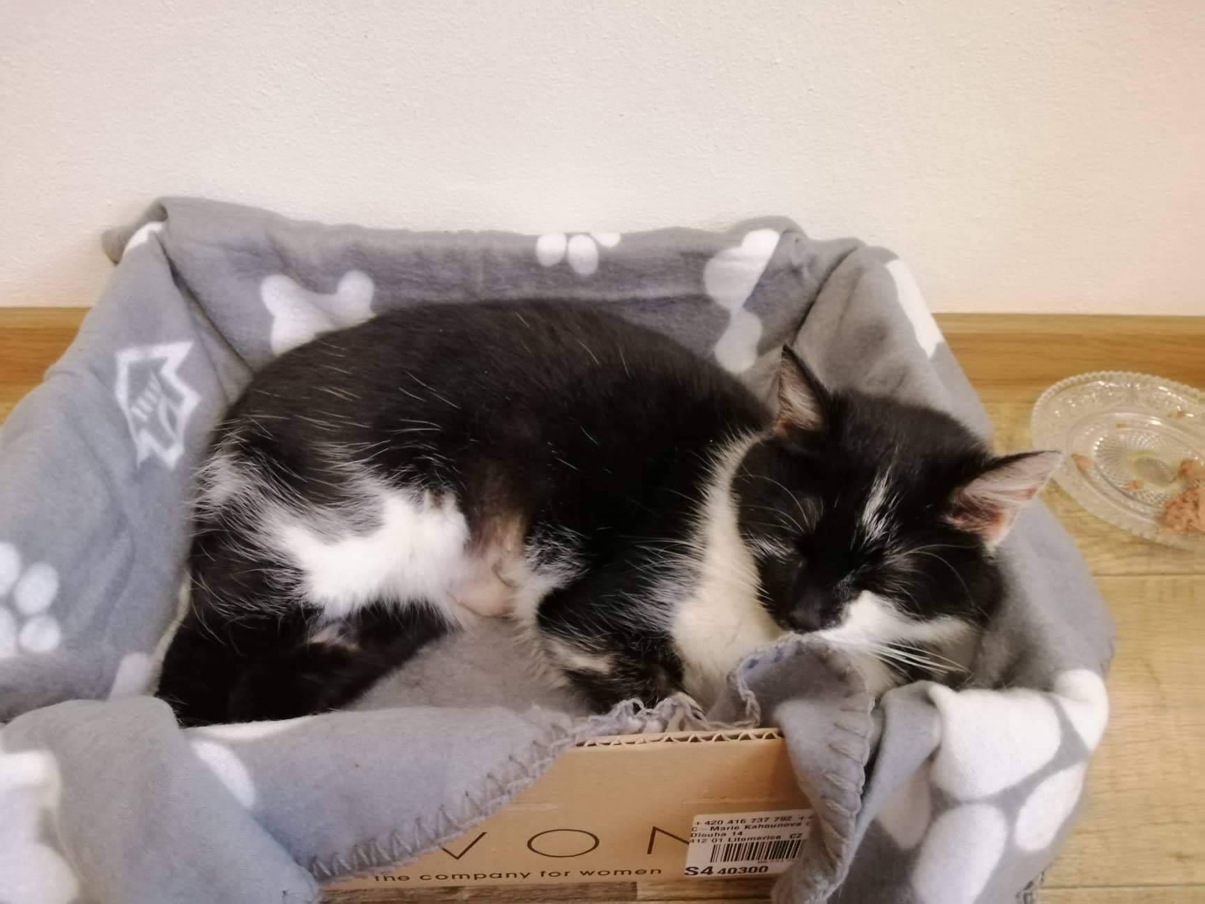 Tak hlásím další pokroky Calamitky 🙂🐈 Je to mazlivá a pěkně zvědavá čiča, hezky basti a pije, teď zrovna spinká v krabici 😀