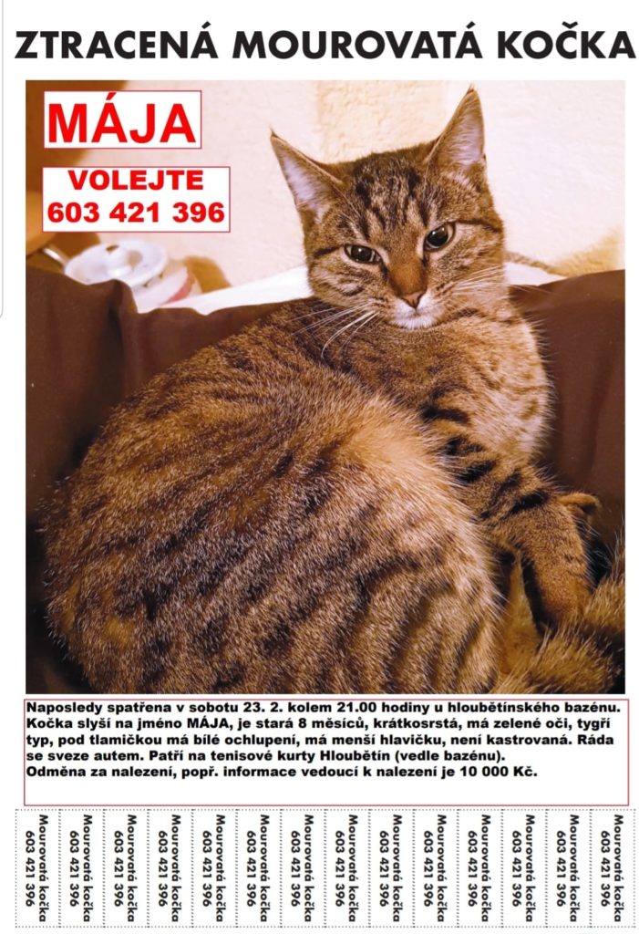 🆘 ZTRACENÁ KOČIČKA 🆘 Vážení, dovoluji si obrátit se na Vás s prosbou. Dne 23. 02. 2019 se mi v oblasti krytého plaveckého bazénu v Hloubětíně zaběhla mourovatá kočka Mája (viz inzerát): Má prosba spočívá v tom, že pokud by ...
