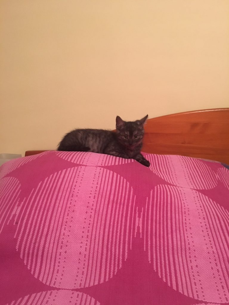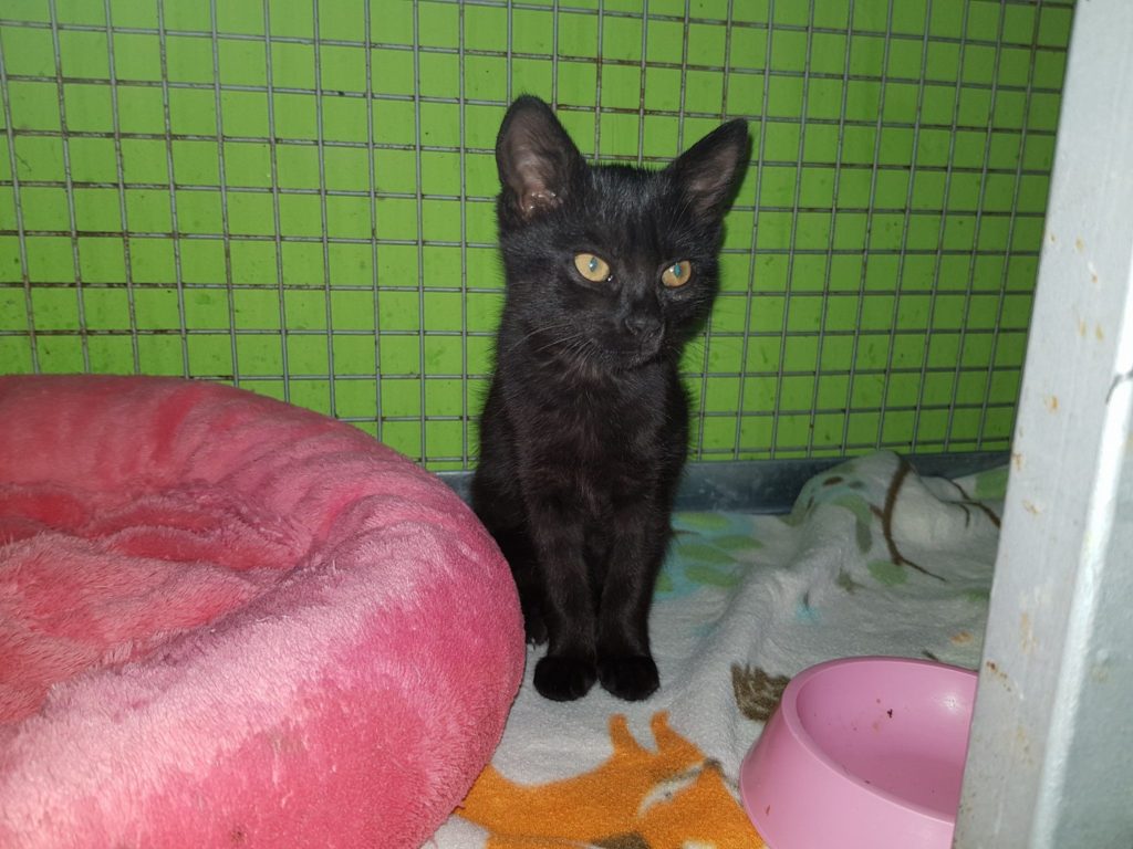 Tak tahle černá asi tříměsíční kotěcí holčička Kayla „spala z nebe“ přímo na zahradu Sluníčka. Byla schovaná v tůjích a plakala. Je zvyklá na lidi, má je ráda, vypadá zdravě, jen byla vyhládlá.