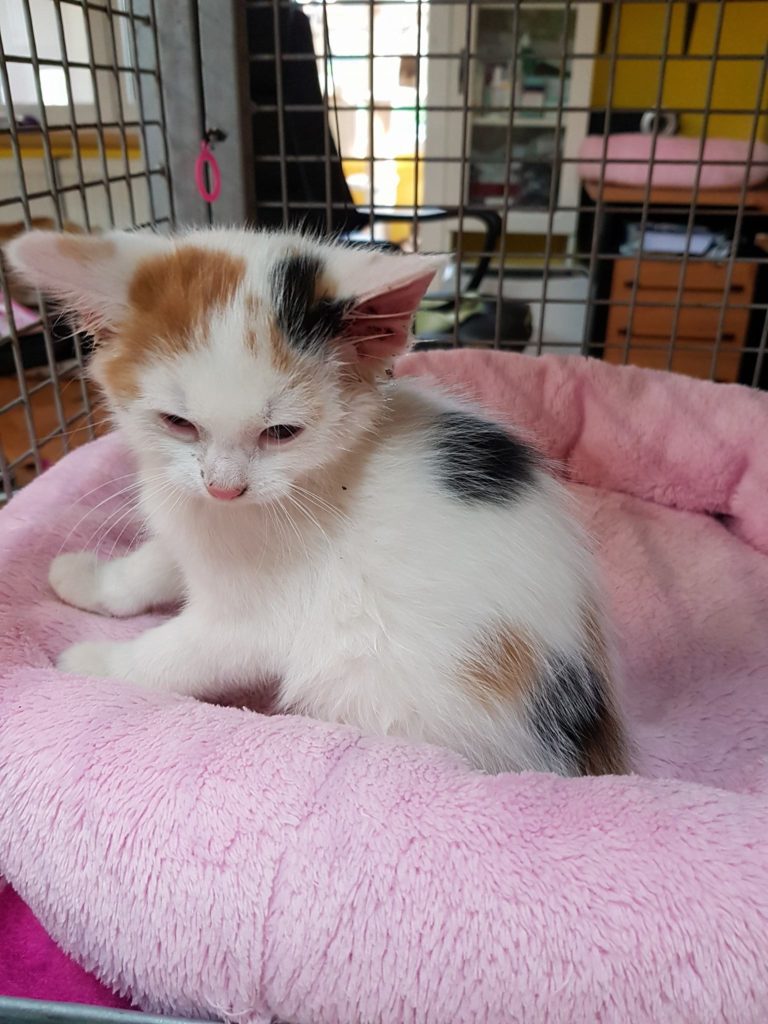 Ranní příjem tříbarevné malé kočičky, zhruba osm týdnů staré, která se motala na frekventované Masarykově ulici v Litoměřicích. Kočička má podlitinu v očičku a vedle očička je od šmíru. Možná se střetla s autem, což naštěstí dobře dopadlo. Dostala jméno ...