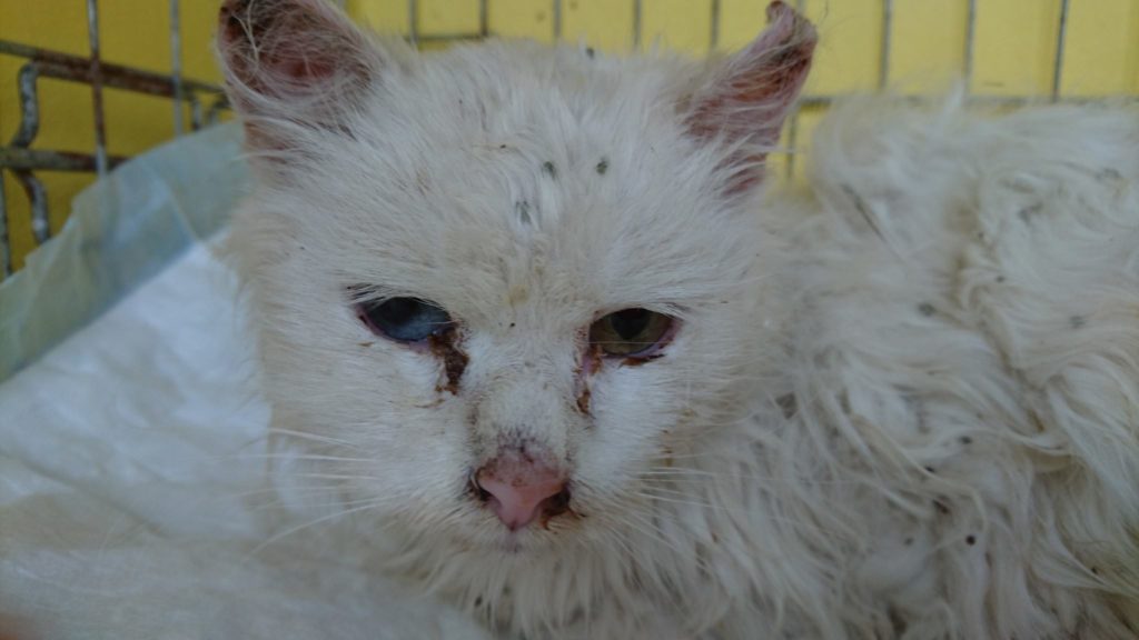 V pátek přijatá kočička Lilien s kožíškem plným kuliček od trávy a suchých větviček, ubohá, s velkou rýmou, zanícenýma očičkama, bolavým zánětem v ouškách, s vystupující páteří a dehydratací. Lilien necítí, sama si proto nenajde mističku s jídlem, chybí ji ...