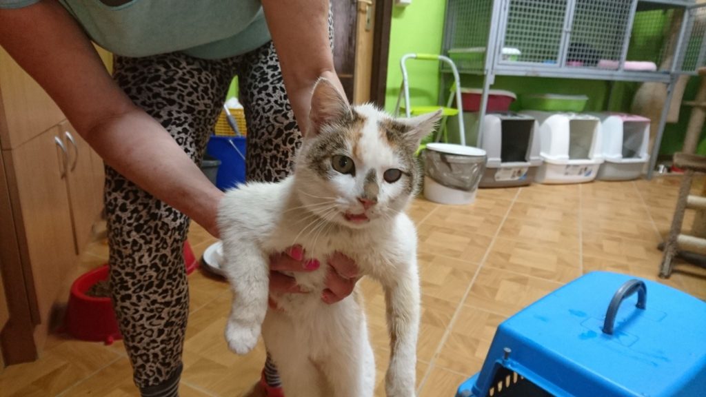 Mourovatý kocourek s bílou náprsenkou byl nalezen u autobusové zastávky ve Chvalíně, sotva stál na zadních nožičkách. Předpokládalo se, že byl sražen autem. Rentgen však žádné nové zranění či poranění páteře naštěstí neukázal. Ríša má abces na patě, staré zranění ...