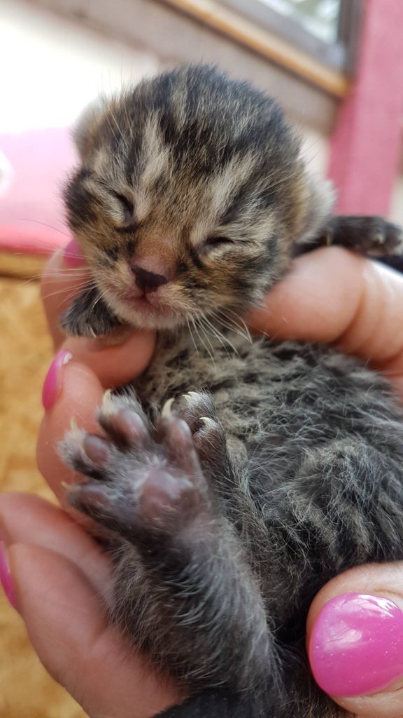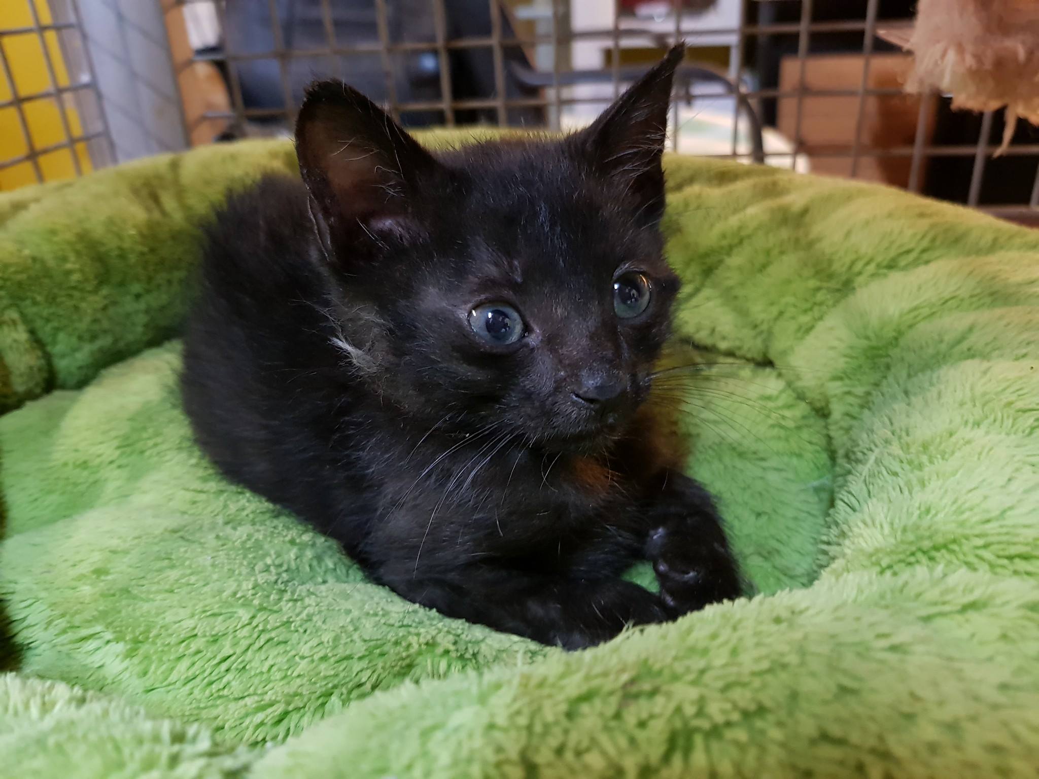 Maličký černý kocourek, který plakal zesláblý v trávě u školy v Libotenicích. Slyšela ho občanka, která bydlí opodál. Byl příšerně prochladlý, studený, hubeňoučký. Při příjmu vážil 202 gramů a bylo mu cca 14 dní. Trošičku jedl a musel být dán ...