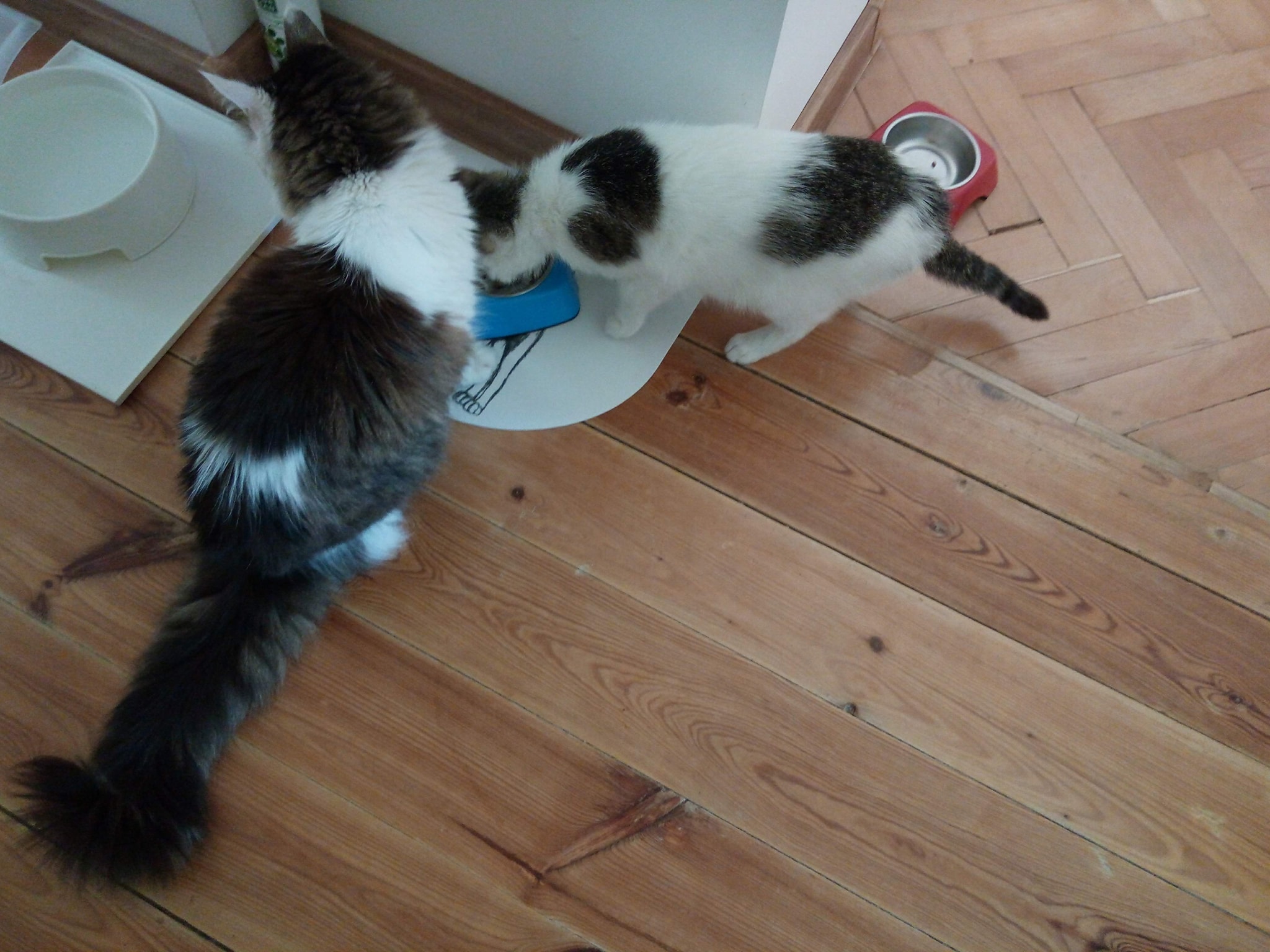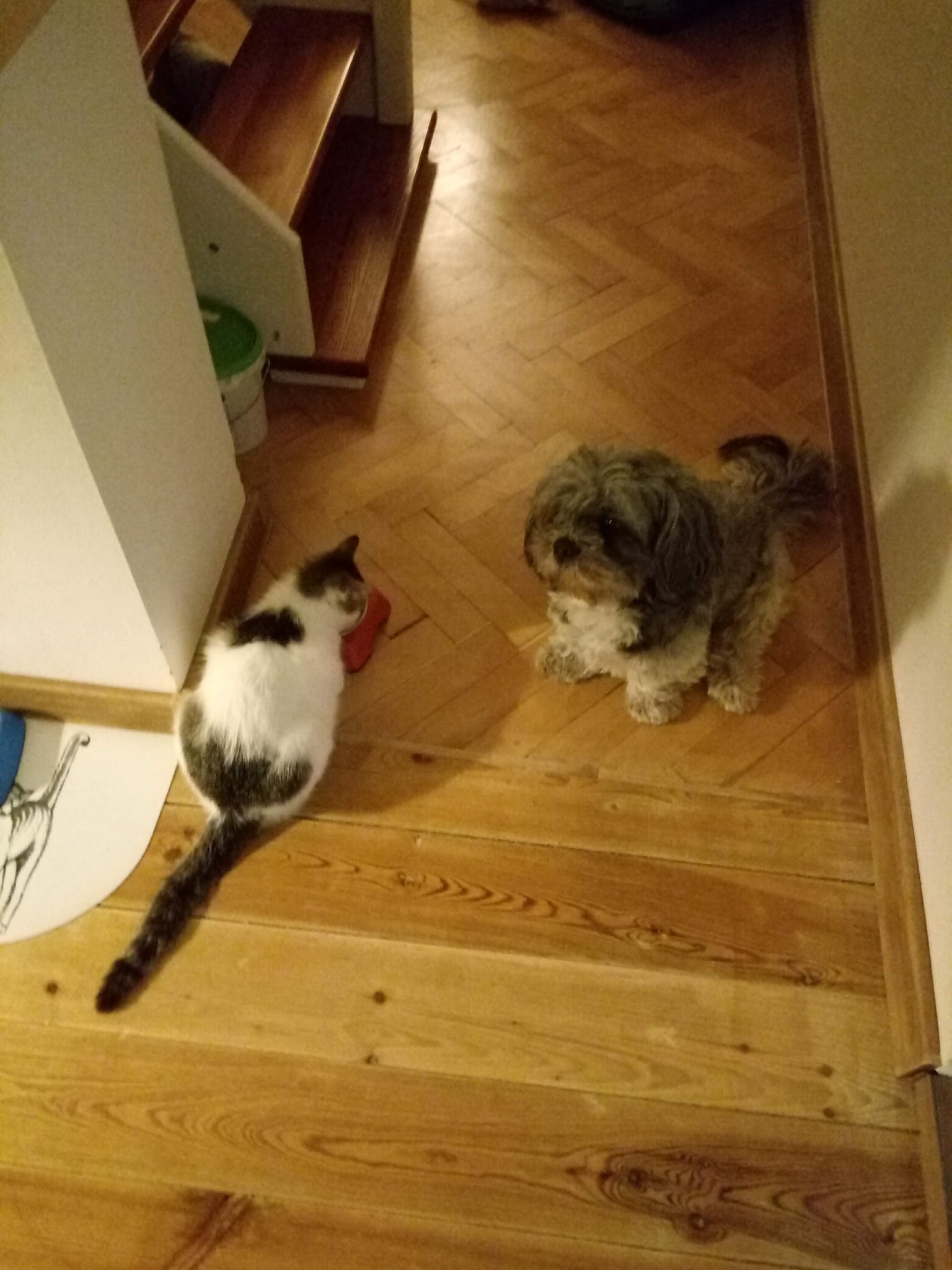 Kocourovi leze do misky, psovi leží na polštáři. Občas si musejí vyjasnit, co se může a co už ne, ale všechno je v klidu a myslím, že spolu vycházejí skvěle.