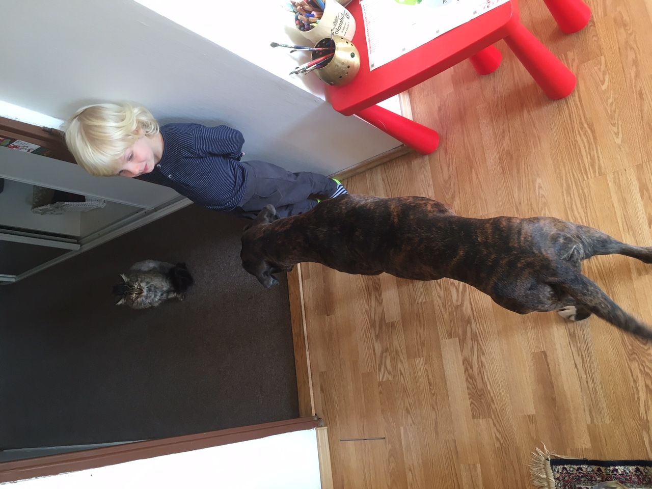 Zvyka si na naseho psika, dokazou uz od sebe bejt i na metr, on trochu syci ale Kato jen kouka, myslim ze do tejdne budou kamosi jako byla Kato s nasim prvnim kocourem (to spolu spali i v pelišu)