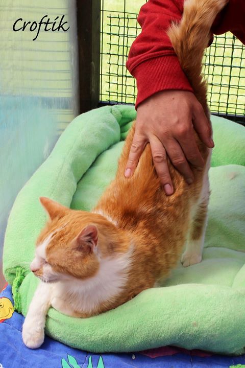 „Říkají mi Croft, ale můj nejoblíbenější donašeč šunky, mi říká Čelisťáku. Mám totiž po operaci rozbité dolní čelisti. Ještě se mi to bude chvilku hojit, ale už mě to vůbec nebolí. Za chvilku budu zase krasavec. Jsem totiž kus chlapa! Díky pravidelné stravě ve Sluníčku se mi jistě brzy podaří nabrat na vysněnou váhu 6 kil. Už jsem připraven odejít do nového domova a myslím, že hledám právě TEBE! Jsem fajn společník a mám rád drbání na hlavě a zádech. Můžeme si tak užívat společné romantické chvilky, co ty na to, majiteli mé vysněné drbací ruky? Budeme žít sami, nepotřebujeme nikoho jiného, určitě ne nějakého smradlavého kocoura! Jsem prostě kočičí samotář a ostatní kocouři mě vytáčí do bělo-zrzava!