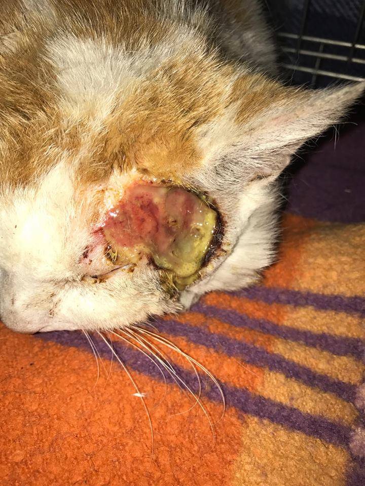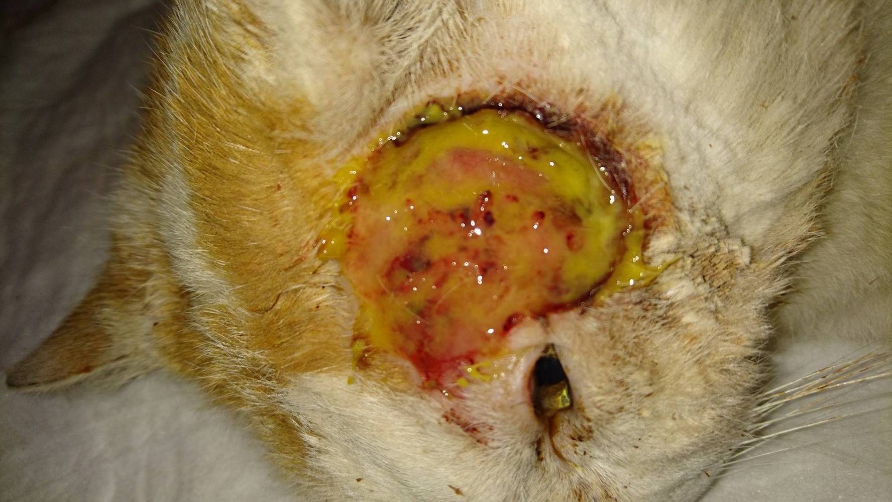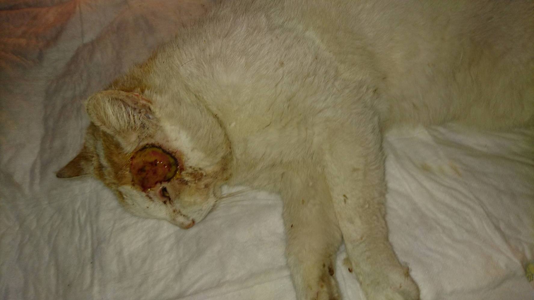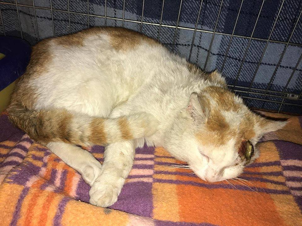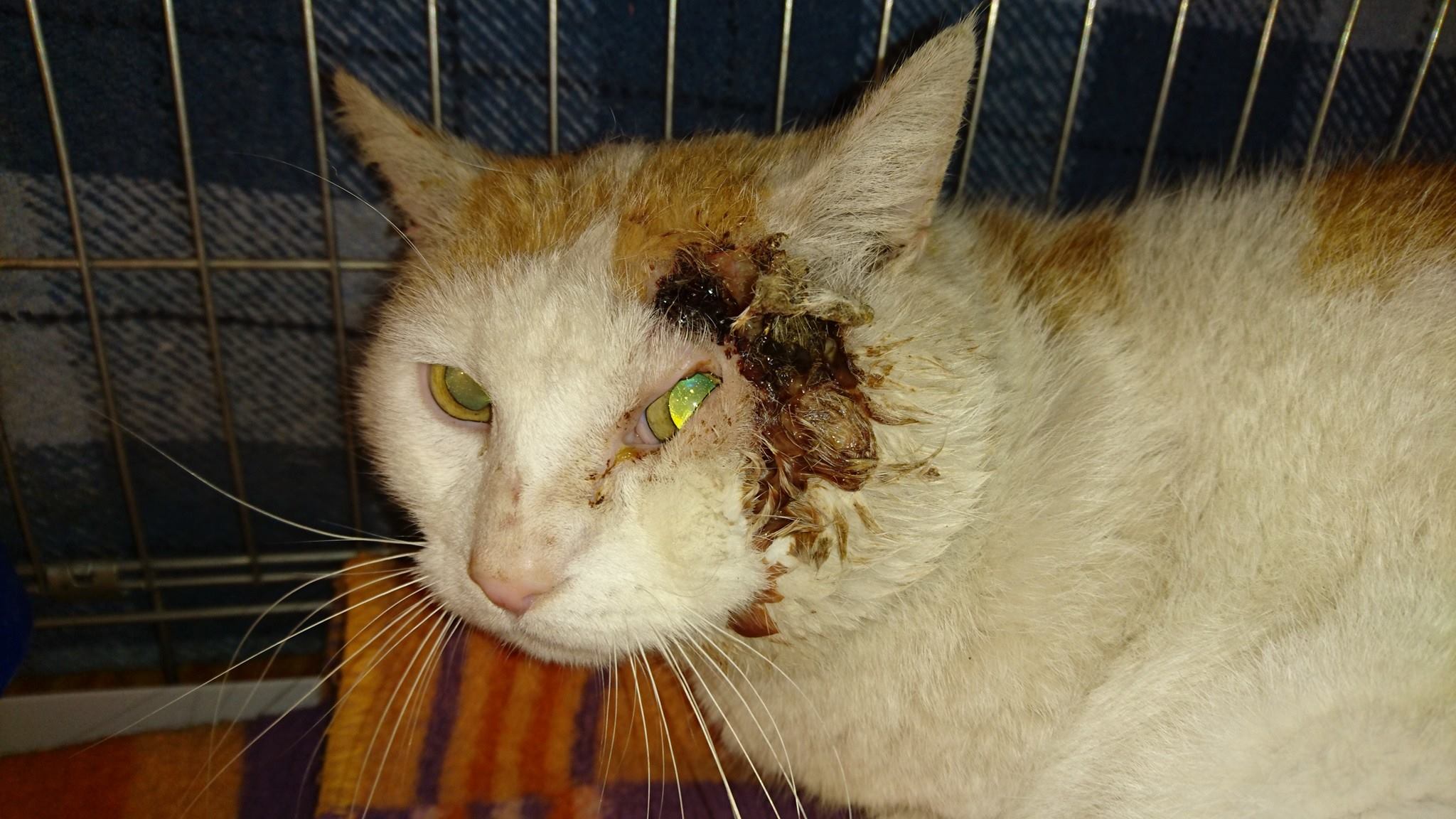 Bílorezavý plašší kocourek z Vědomic, který nikomu nepatří a chodí se přiživovat na zahrádku k jiné kočičce. Oslovila nám paní, která tuto svojí kočičku s tím, že kocourek, který k nim chodí jíst je raněný a není možný ho odchytit. Povedlo se kocourka odchytit do sklopce a byl přijat do Sluníčka. Rána je ošklivá a hemžila se spoustou červů. Kocourek byl u paní doktorky uspán, rána mu byla ošetřena a byl i vykastrován. Přivezla jsem ho spícího do Sluníčka a ránu jsme s Janou ještě doošetřily. Z rána stále vytéká hnis. Nyní je kocourek již vzhůru a povedlo se mi ho zase ošetřit, měla jsem obavu, jak bude reagovat. Ráno si na sebe nechtěl nechat sáhnout. Tak uvidíme, jak to s ním půjde. Zranění bude nutné kocourkovi ošetřovat několikrát denně.