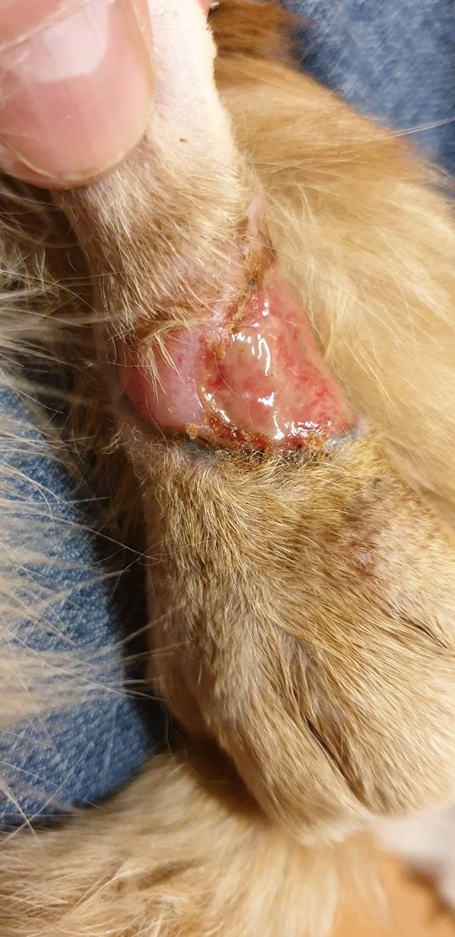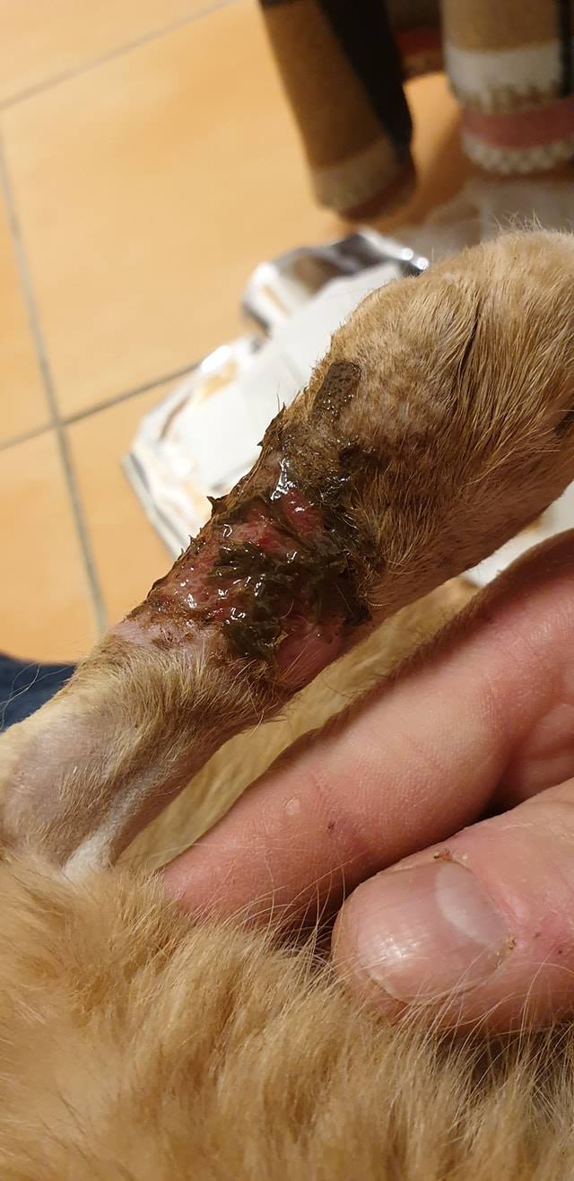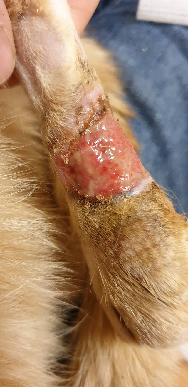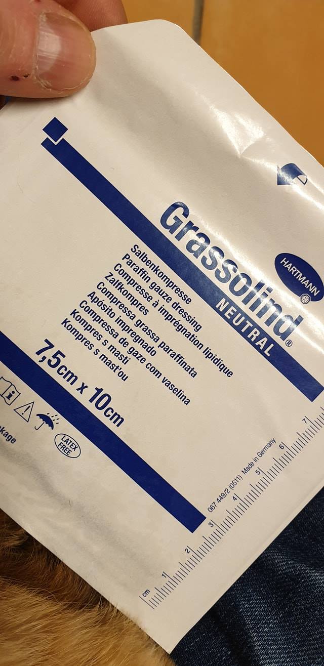 🔸Warriorovi musíme stále převazovat poranění na noze. Tkáň se pomalu, ale úspěšně hojí. Ještě musíme sehnat specielni mřížkove polštářky podporující hojení ran a tvorbu nové tkáně.