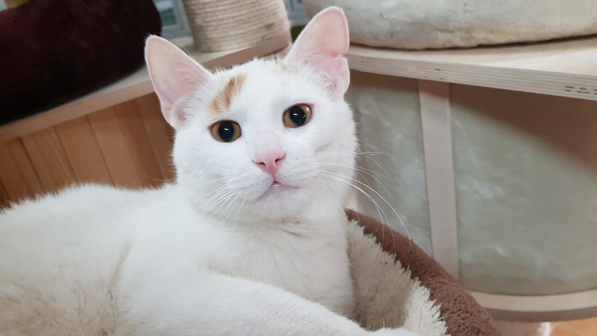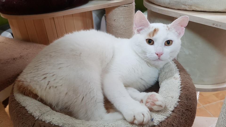 Bílý kocourek s rezavými flíčky se potloukal v obci u základní školy. Je moc hodný, nekonfliktní a mazlivý. Vzhledem k tomu, že musel být v rámci života na ulici vůči lidem obezřetný, bude potřebovat maličko trpělivosti při aklimatizaci v novém domově. Novým domovem může být byt či domeček s bezpečným výběhem po zahrádce.