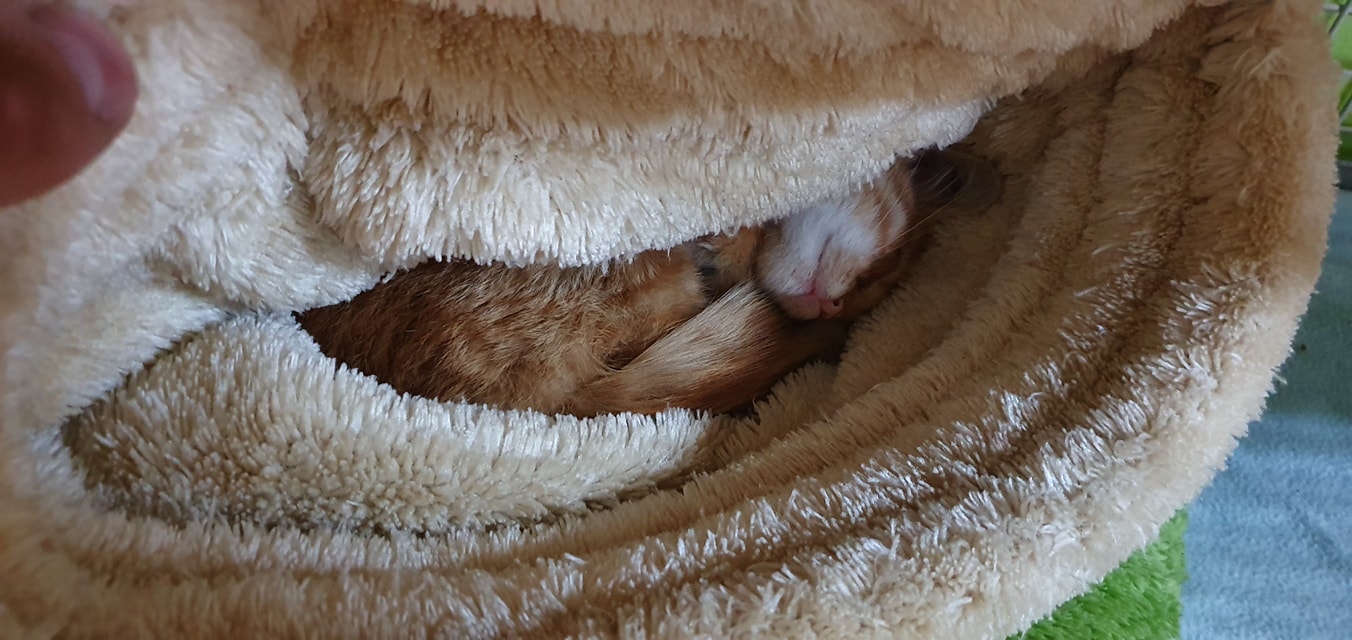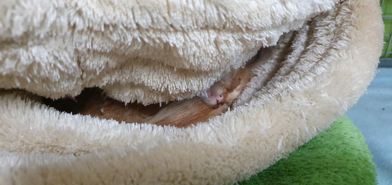🔸 V místě nálezu byl dlouho bez jídla. Dnes musel být zahříván vyhřívací dečkou a dostal miminkovsky pelíšek, aby mu bylo tepleji.🔸 Také dostal výživnou bastu a vodu strikačkou, zda se nám totiž, že moc nejí.