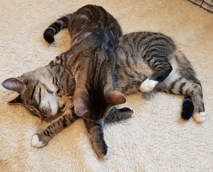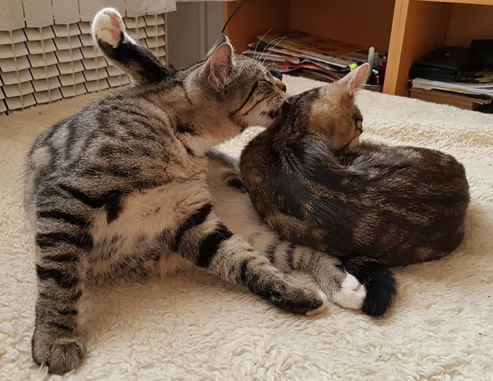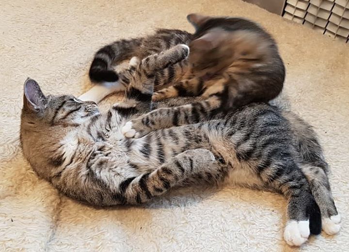 Jen nevíme jestli je to kočka nebo spíš smíchanina několika zvířátek. Barvu má z několika koček, krk natahuje jak žirafa a vyhazuje zadní (králičí pacičky) tlapky jak koník, proto ji občas říkáme Franky Steinová nebo Sešívaná 😀 Je to pěkné číslo a s naším druhým kotětem Charliem jsou kámoši a strašně řádí.
