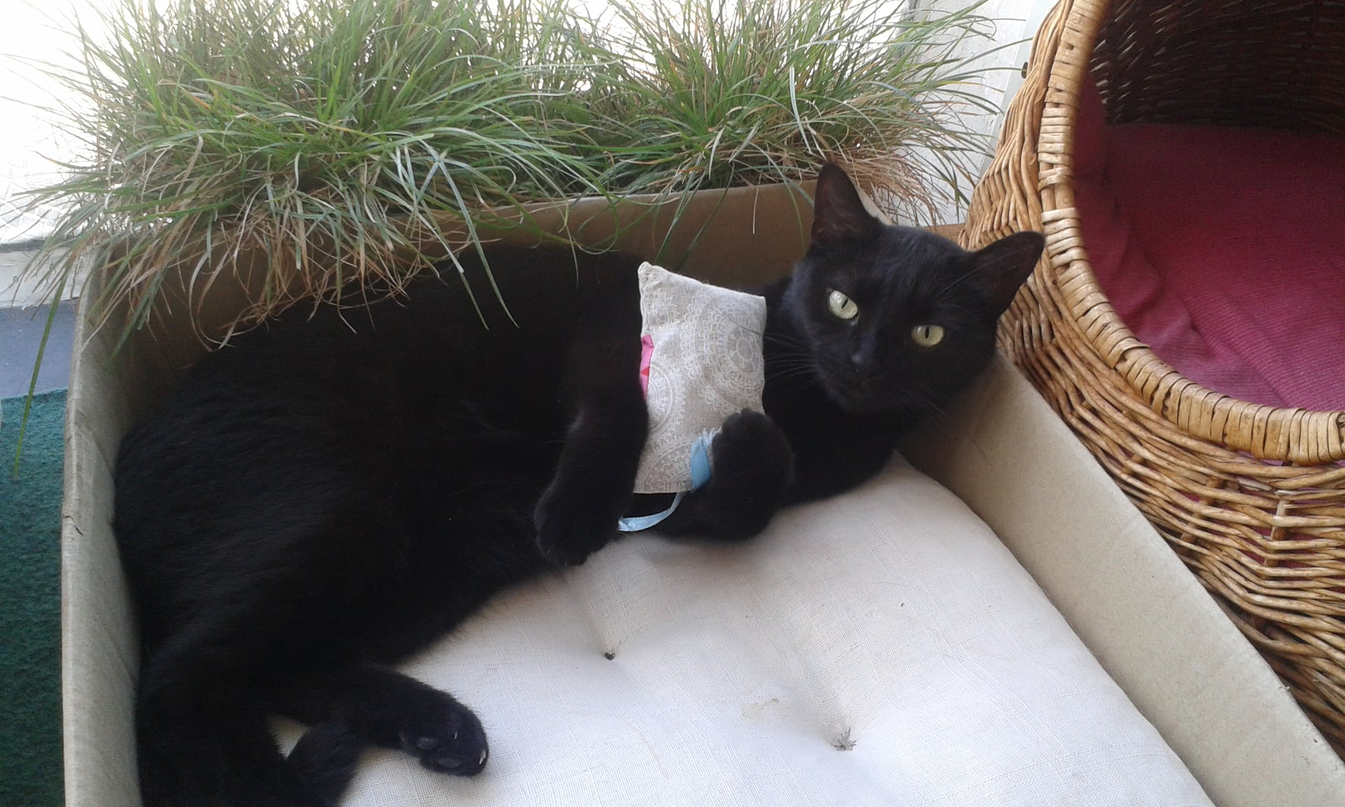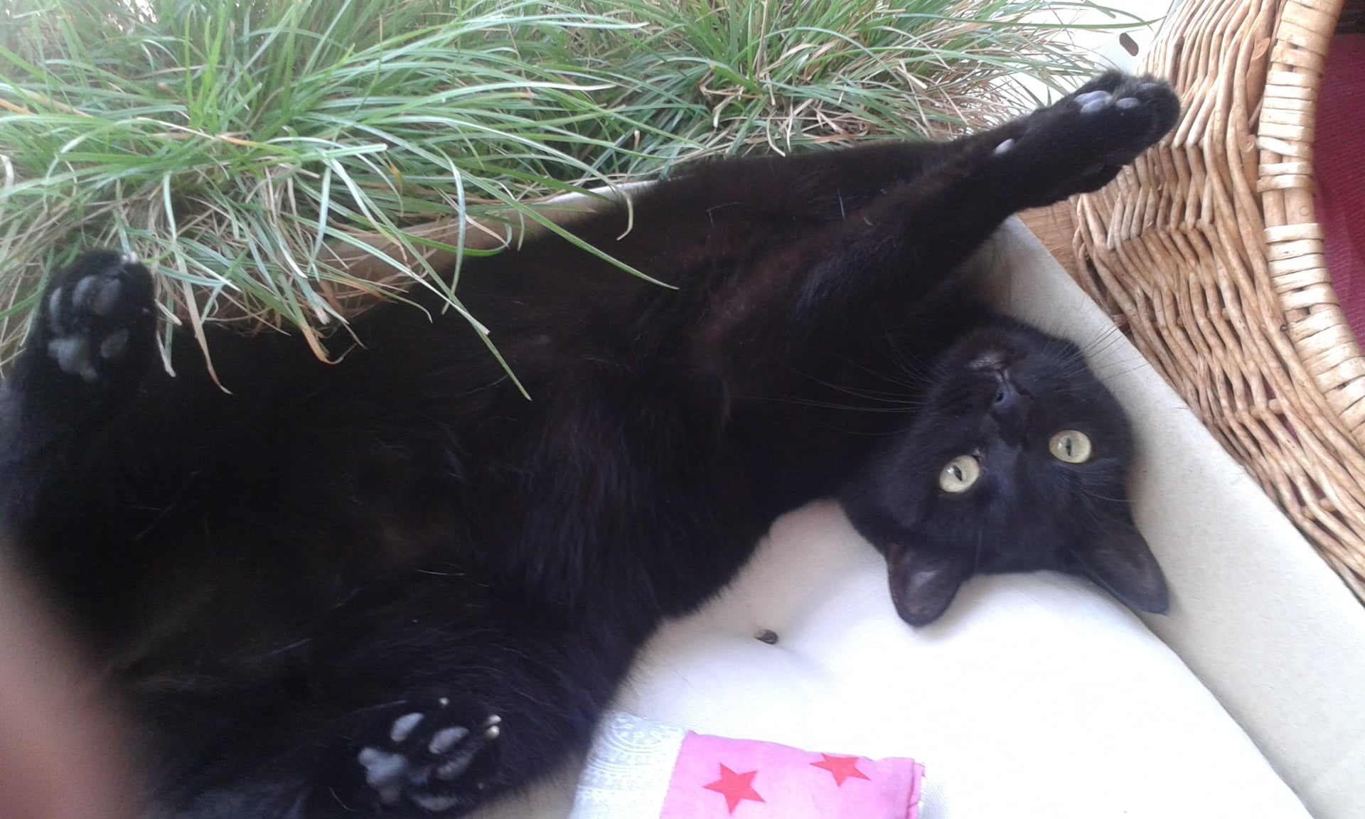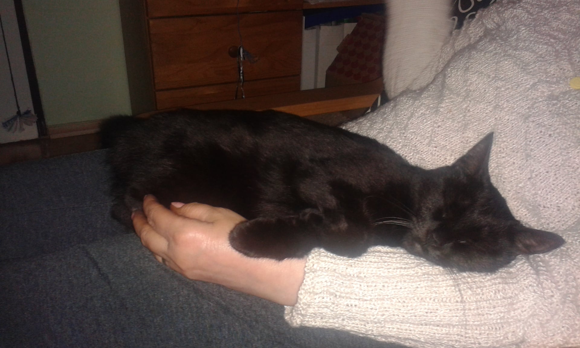 pozdrav z domova vám posílá Elinka, extrémně plachá kočička z depozita u Míši v Praze-Chodově, která nám dělá radost už pět let. Dohání období plachosti každý den a my jen žasneme nad tou změnou. Lítá po bytě jako dračice, hraje si se vším, co uvidí, provokuje kocoura k honičkám, vyskočí mi na klín, kdykoliv se posadím, vrní a "šlape" jak o život, v noci mi chodí do postele a spí u mě pod přikrývkou. Doprovází mě po bytě na každém kroku, u všeho musí být a vůbec ničeho se neleká. Ráda se nechává kartáčovat, zvládá i stříhání drápků, míluje hlazení a vyvalování na sluníčku. Prostě je to sluníčková kočička!