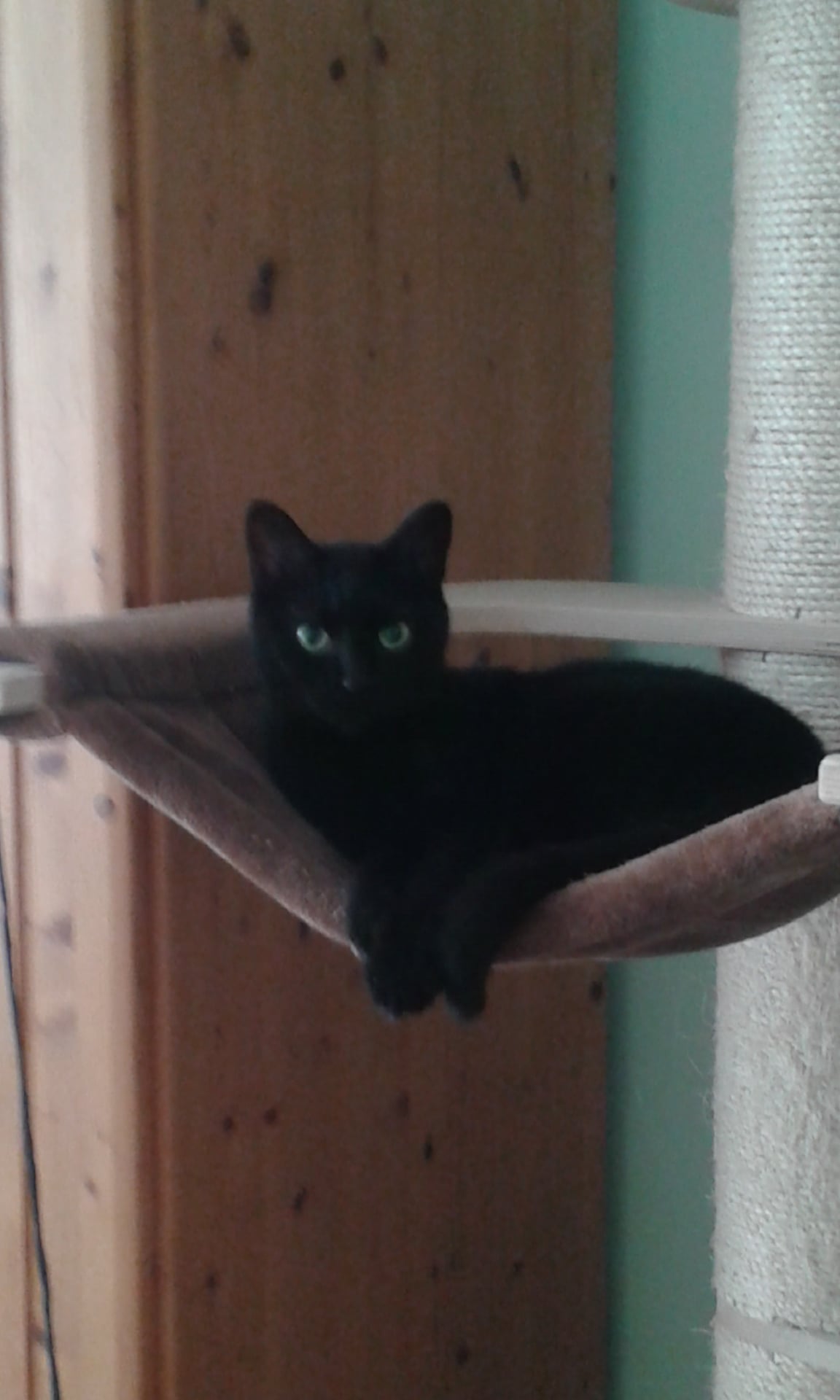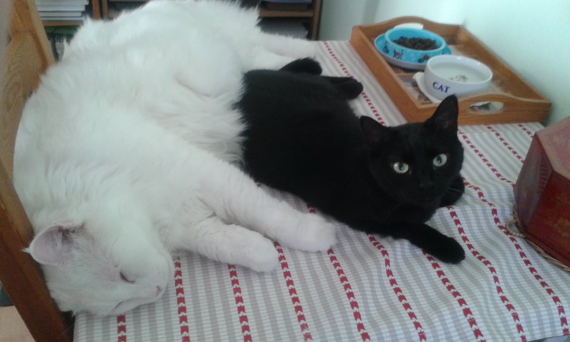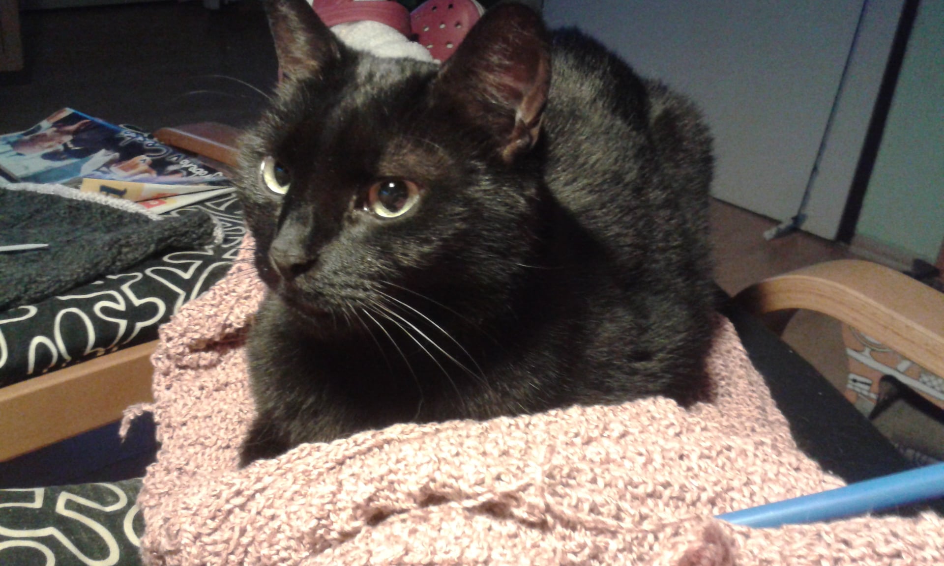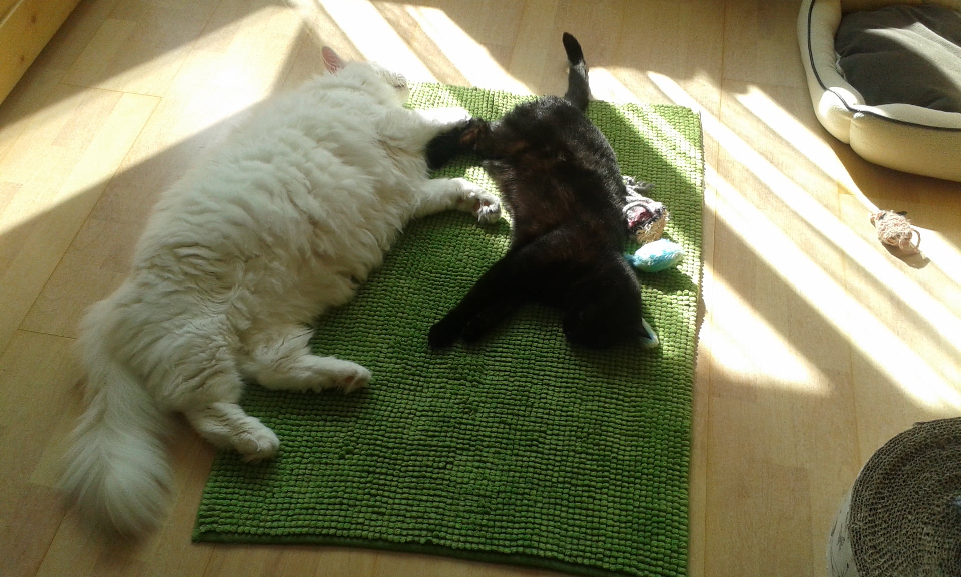 pozdrav z domova vám posílá Elinka, extrémně plachá kočička z depozita u Míši v Praze-Chodově, která nám dělá radost už pět let. Dohání období plachosti každý den a my jen žasneme nad tou změnou. Lítá po bytě jako dračice, hraje si se vším, co uvidí, provokuje kocoura k honičkám, vyskočí mi na klín, kdykoliv se posadím, vrní a "šlape" jak o život, v noci mi chodí do postele a spí u mě pod přikrývkou. Doprovází mě po bytě na každém kroku, u všeho musí být a vůbec ničeho se neleká. Ráda se nechává kartáčovat, zvládá i stříhání drápků, míluje hlazení a vyvalování na sluníčku. Prostě je to sluníčková kočička!