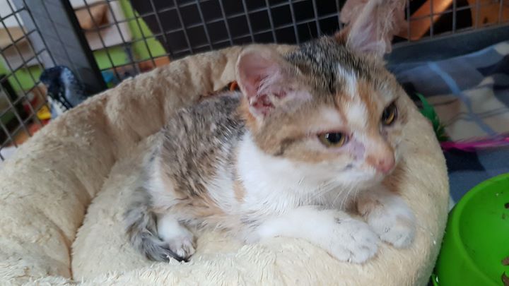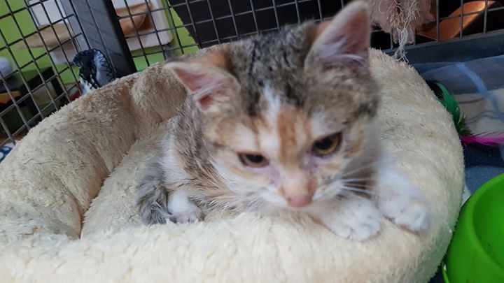 s velikou chutí baští, už si v kleci hraje, je to úžasné, milé a mazlivé kočičí stvoření. Z čista, jasna se bjevila na zahradě u rodinného domu v obci Kleneč, u lidí, kteří se snaží kočičkám v okolí pomáhat.