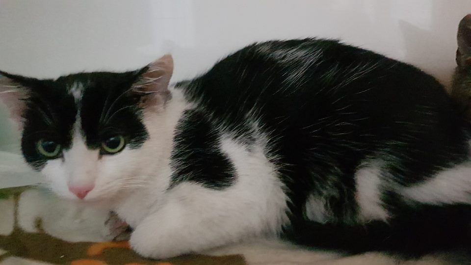 Černobílý kocourek Filísek z Trávčic, narozený v květnu 2017. Velmi mazlivý, hodný. Filísek při příjmu važil 3,3 kg.