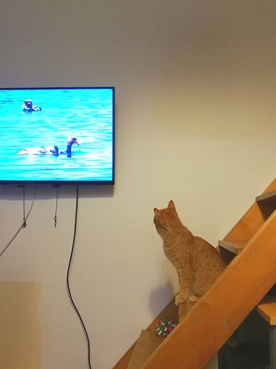 Jantárek miluje míčky a každou noc hraje kočičí fotbal. A taky teď frčí televize a programy o zvířatech, obzvlášť ptáky sleduje s velkým zaujetím, až mu to musím občas přepnout, když už vypadá, že skočí.