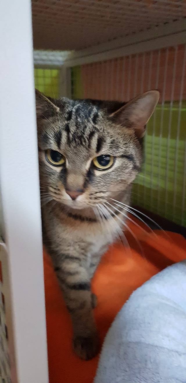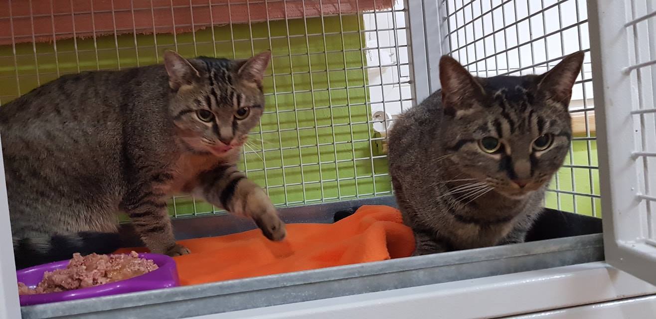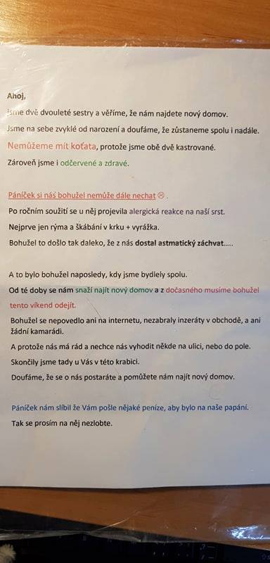 Tyhle dvě krásné slečny jsme našli v přepravce a v krabici na chodníku před útulkem. Musely tam být už od pozdního večera, neboť měly pročůranou deku a byly hodně naštvané. Ke kočičkám jsme dostali i průvodní dopis. Obě holčičky jsou nádherné, ve skvělé výživové kondici, jsou dvouleté, kastrované, jsou to sestry. Jejich původní jména neznáme. Důvodem jejich odložení byla silná alergie a astma. Původního majitele vůbec neodsuzuji, k tomuto činu ho dohnalo zoufalství, neboť žádný útulek mu z kapacitních důvodů nepomohl a nový domov pro obyčejné mourovaté kočičky se mu nepodařilo najít.