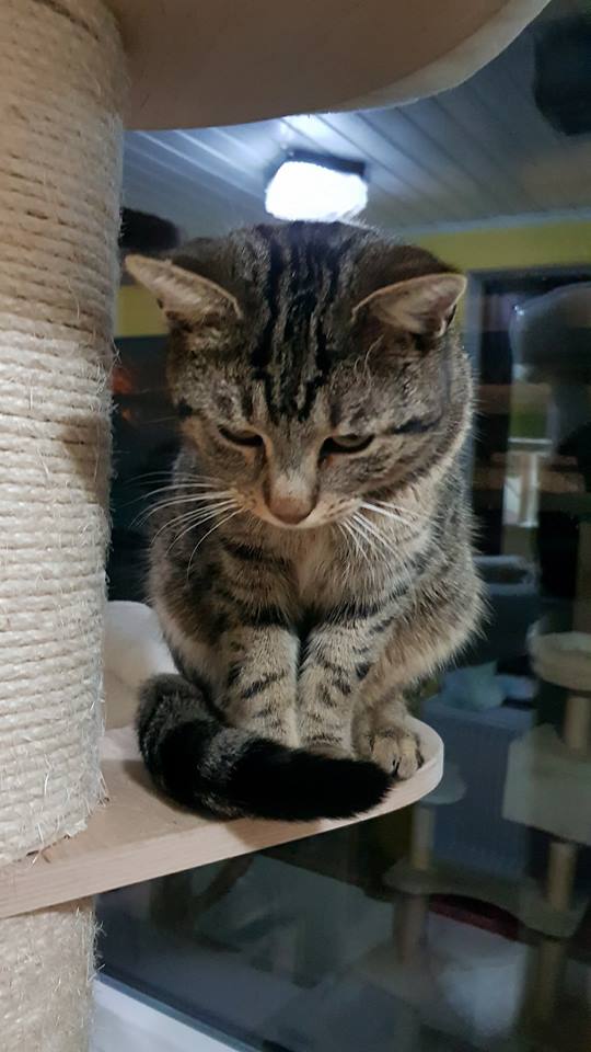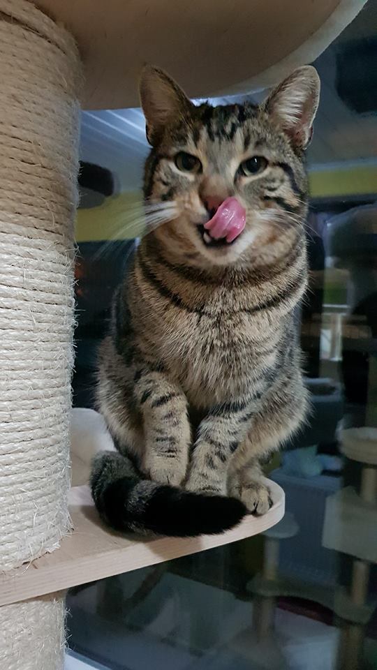 Další kocourek z Travčic, mourovatý, asi dvouletý Jonášek. Má hezkou kresbu. Je mazlivý, kontaktní, údajně ho ostatní kočičky v Travčicích terorizovaly. U nás mezi kočičkami, s kterými i původně žil, je v pohodě. Má trošku respekt z cizích lidí.