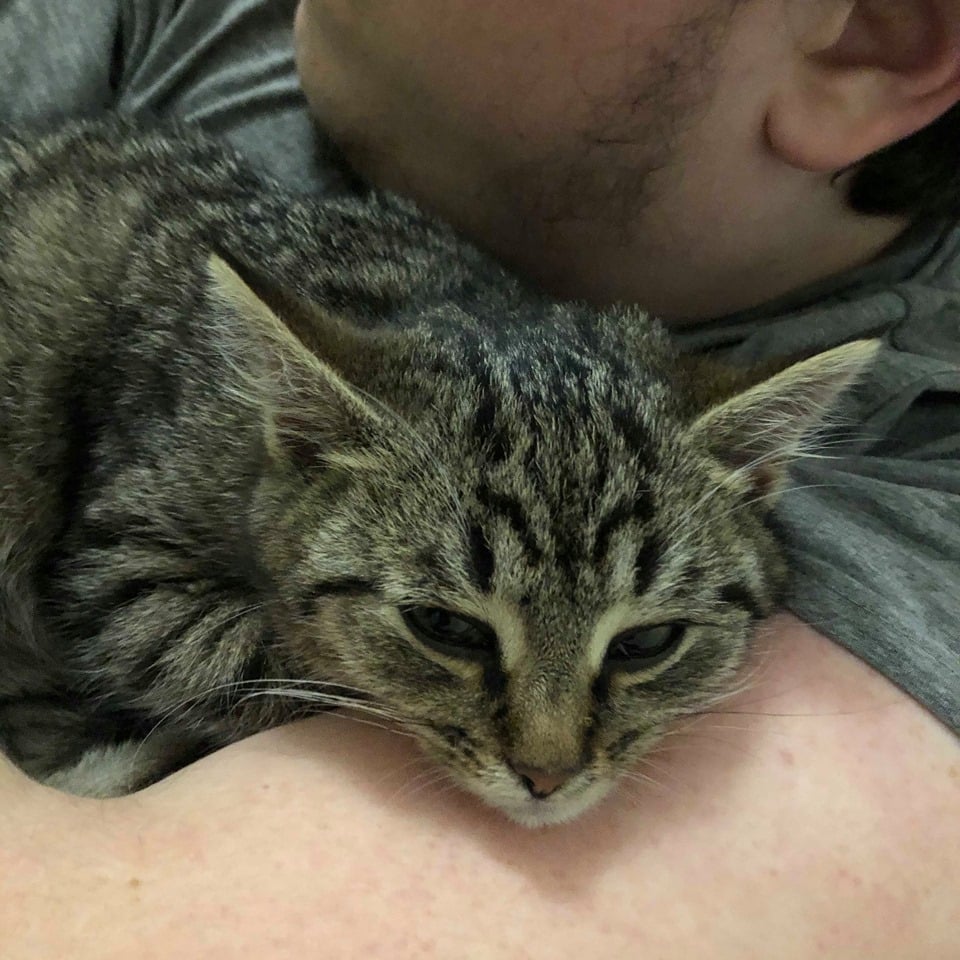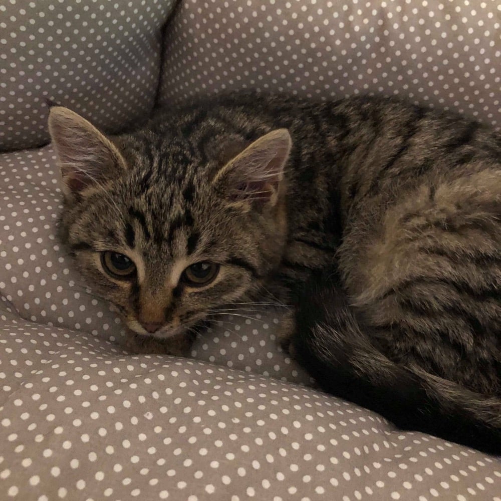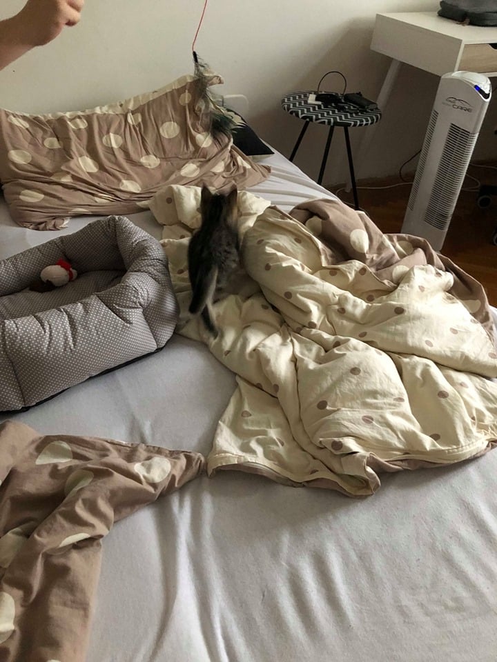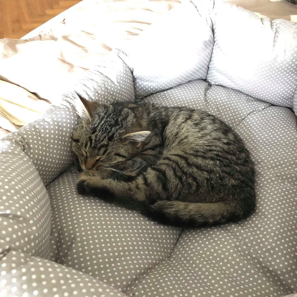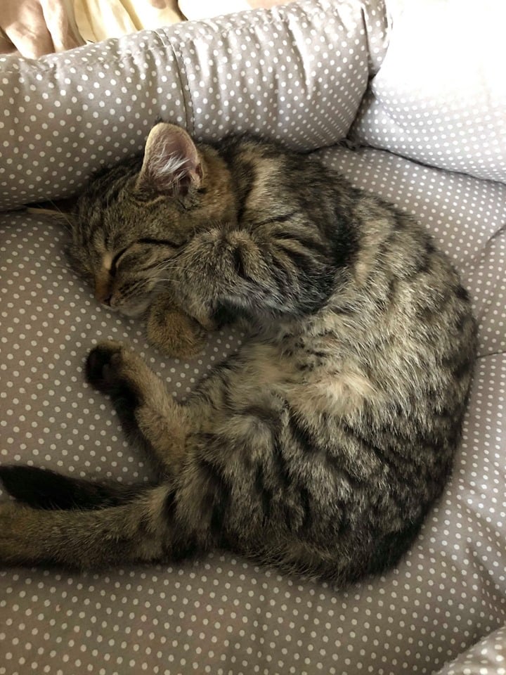 Rano se mazlila a pak uz se i rozdovadela, je to dracice. Ted odpociva. Na zachod uz si zvykla a i hezky papa. Byt uz trochu prozkoumala ale prijde nam, ze je jeste hodne nejista, ale to chce cas. Jinak svuj pelisek si moc oblibila a vypada, ze se v nem citi v bezpeci.