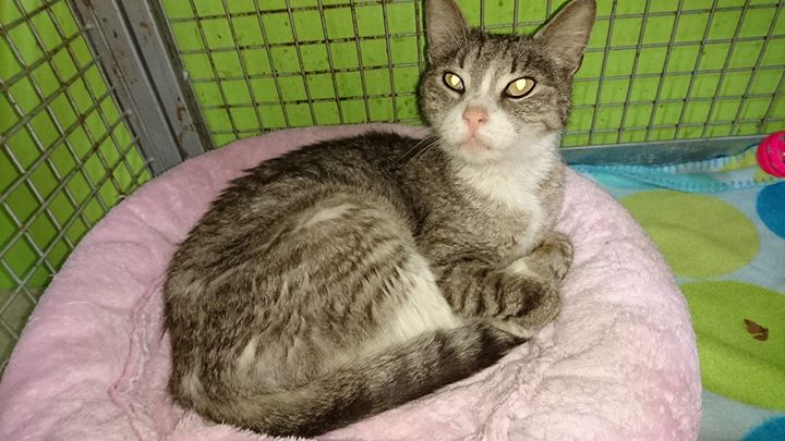 Kočička nalezená v zahrádkářské kolonii Hoštka. Je tam sice hodně kočiček, většina plachých a Sluníčkem kastrovaných. Tahle kočička je tam nová, byla hodně hubená, žadoní o přízeň a tamní kočičky jí zaháněly. Je to veliká mazlivka, je jí tak pět let.