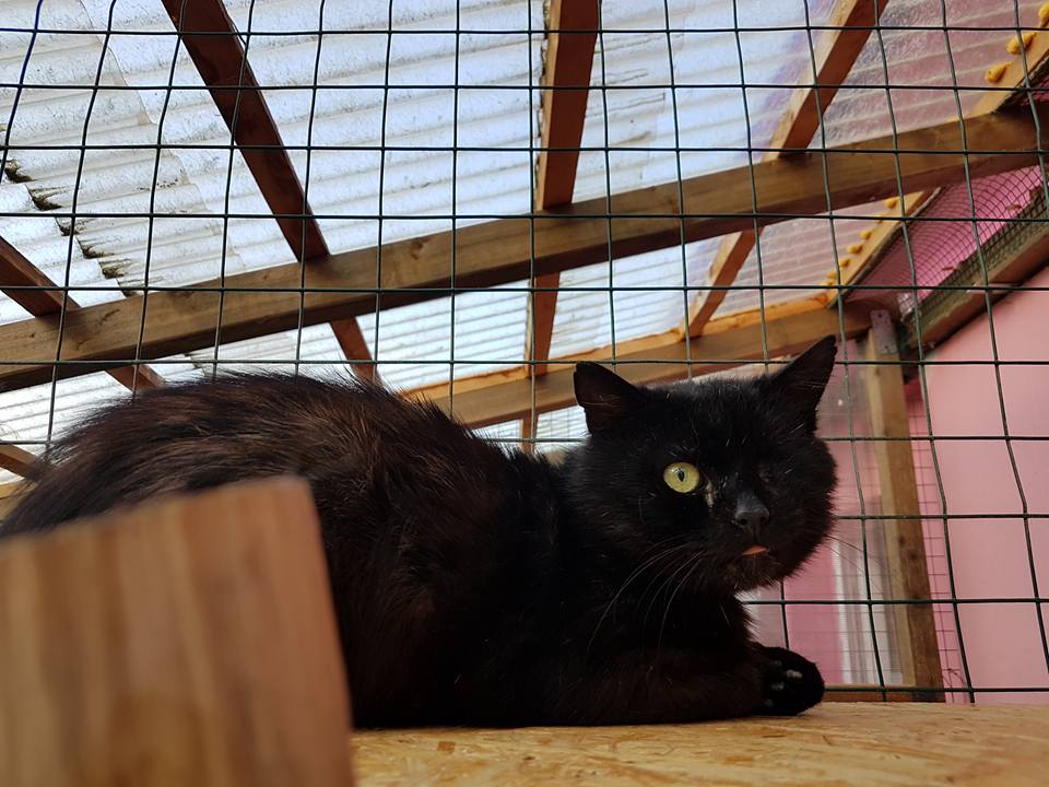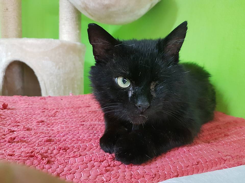 Ve své domovské lokalitě (obec Dušníky) měl hodnou paní krmičku, která o něj pečovala. Bohužel okolní lidé už tak ohleduplní a kočkomilové nejsou. A proto že je kocourek extrémně důvěřivý, hodný, mazlivý, kontaktní, nekonfliktní a submisivní, dostával od ostatních koček v lokalitě a od lidí pěkně zabrat. Muselo mu být vyjmuto jedno očičko, jeho srst je strašná, vylysaná, na mnoha místech ztrácí svou krásnou temně černou barvu. Hledá nový domov, náruč nebo klín plný dobrého jídla, lásky a hlavně mazlení.