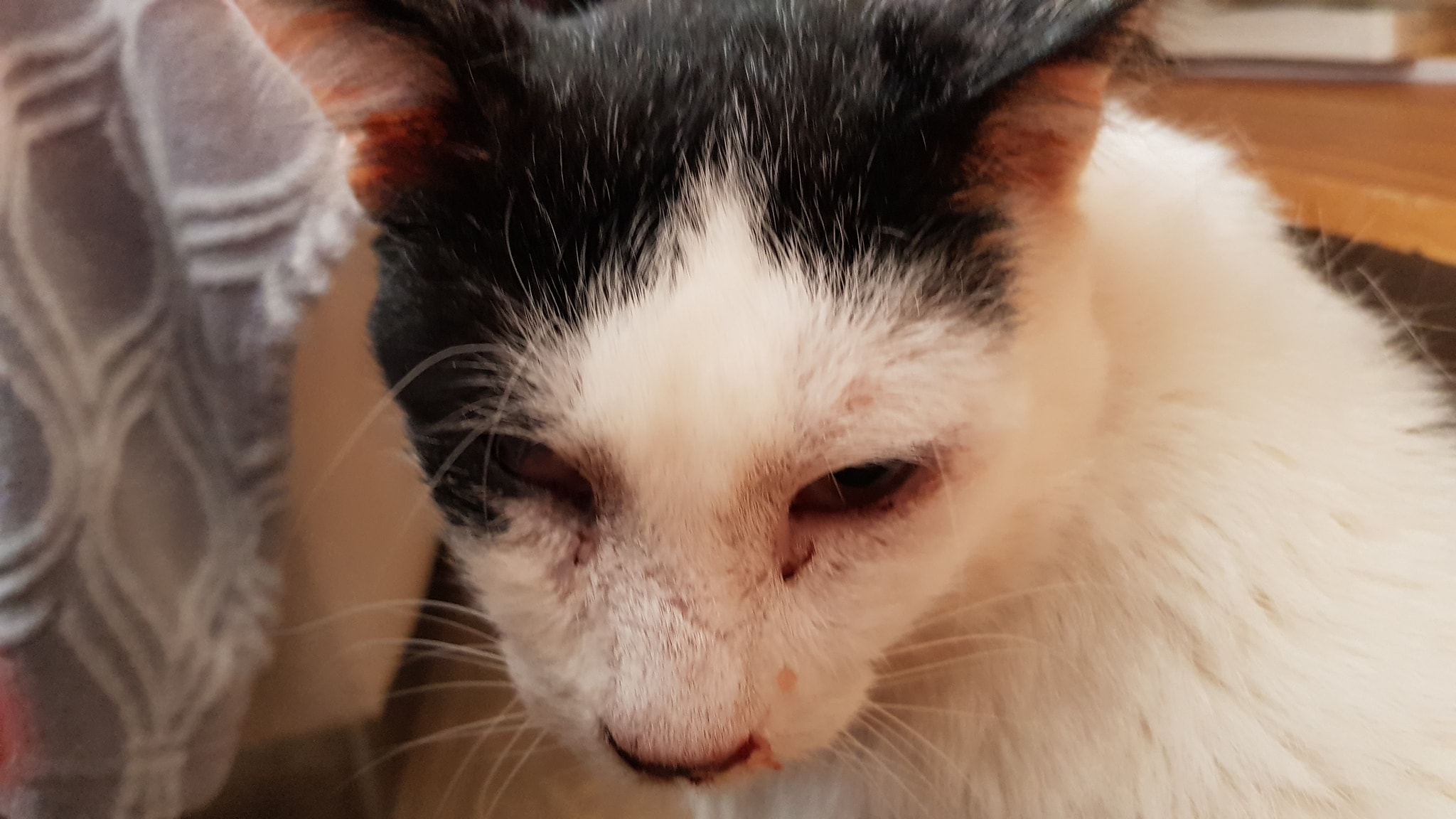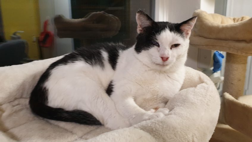 🔶Černobílého, starého kocourka Šmudlu máme ve Sluníčku již druhým rokem. Přišel hodně zubožený, vyhublý, s ošklivou ránou na nožičce, postiženým očičkem a chronickou rýmou, viz. popisek a pár fotek ze srpna 2018 po příjmu a hospitalizaci na veterinární klinice: