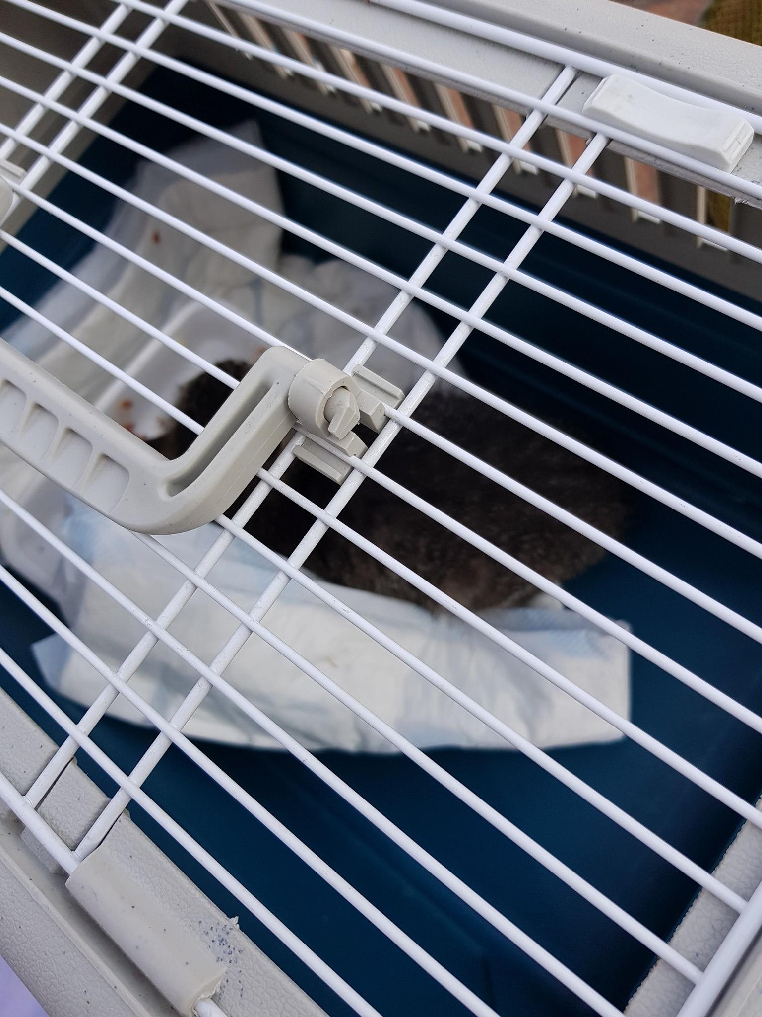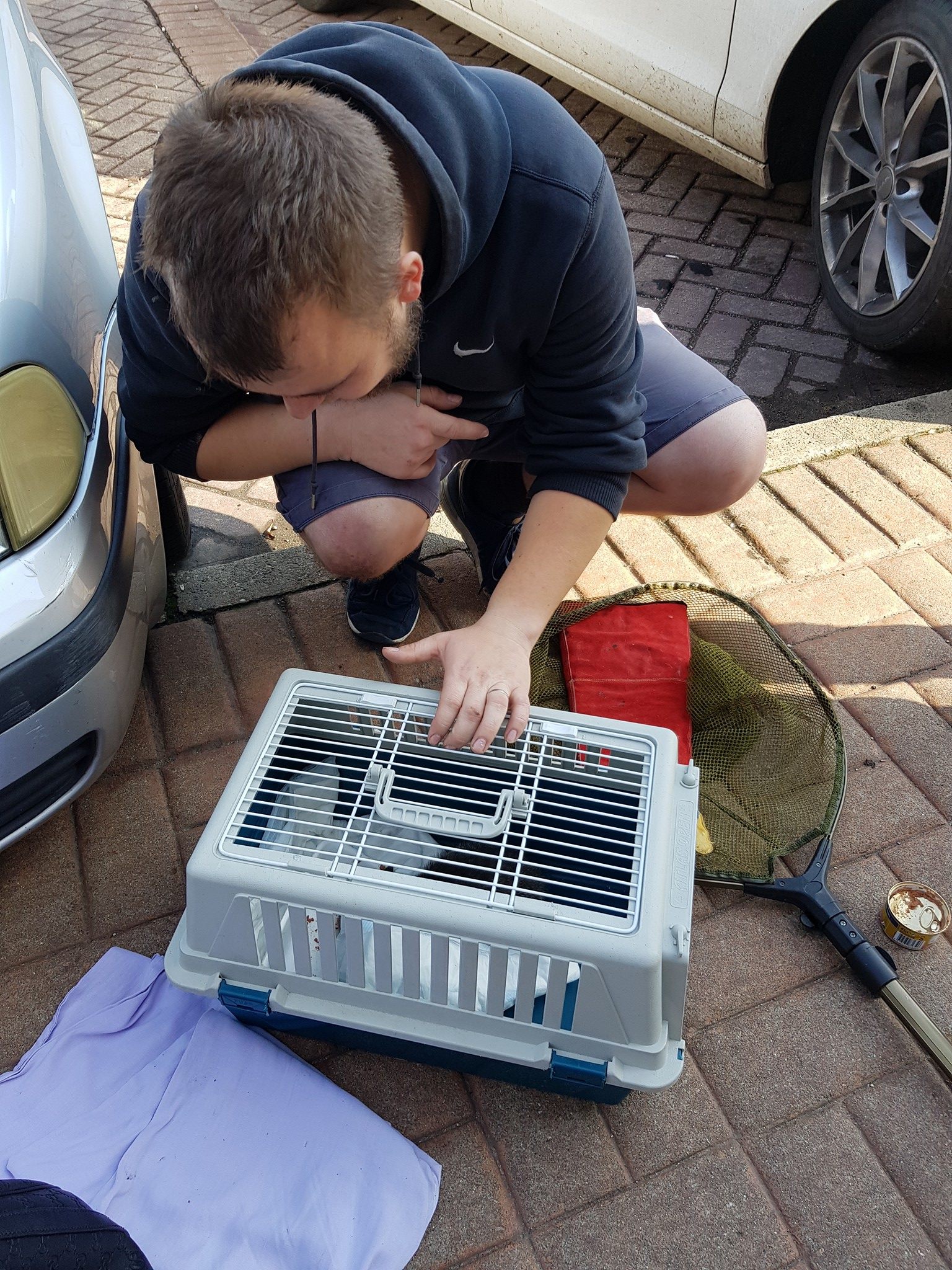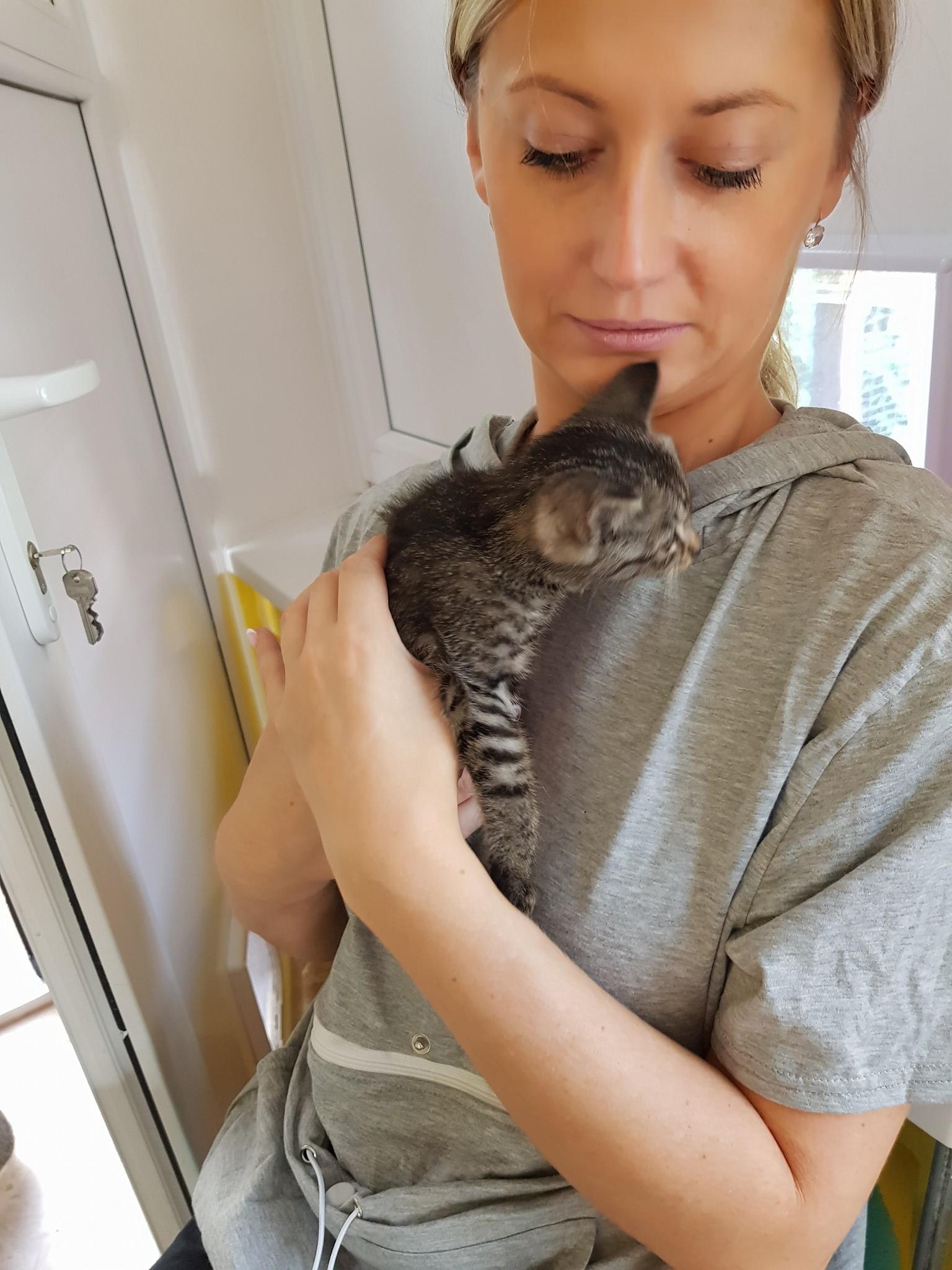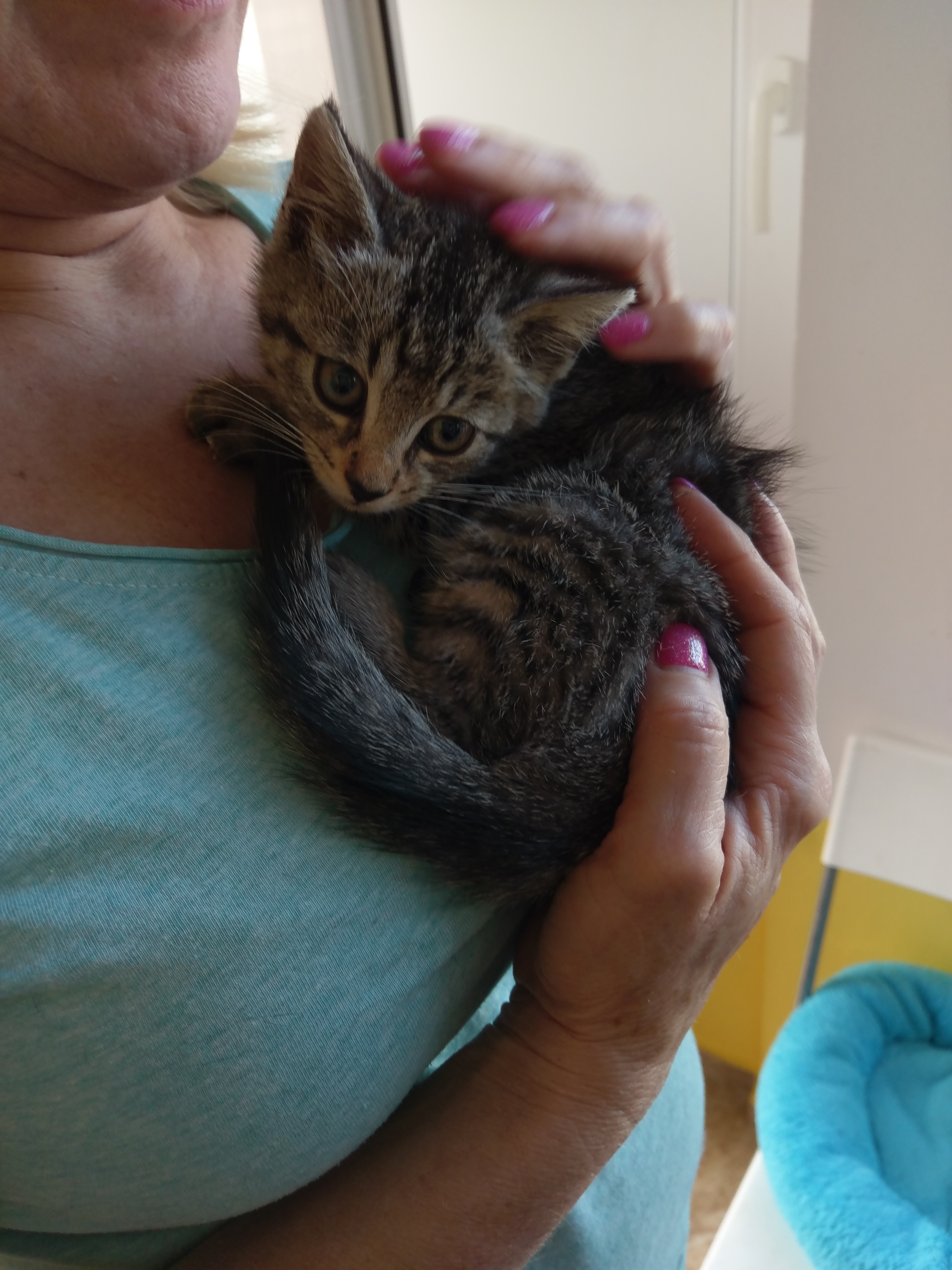 Mourovatý kocourek, jehož záchrana trvala celé dopoledne. Byli jsme přivoláni k mňoukajícímu kotěti v motoru odstaveného auta. Od časného rána budilo pozornost u kolemjdoucích, avšak jeho pláč nenechalo chladnou až naší příznivkyně – dobrovolnice, které spěchaly kolem automobilu do zaměstněnání. Byla kontaktována městská policie, nic se však nevyřešilo, neboť do motoru se údajně nebylo jak dostat. Nemohla jsem se s tímto tvrzením smířit a se svým zetěm a dvěma kámoškami jsme jsme jeli situaci vyřešit. Majitel auta se nenašel, kotě plakalo, nakonec po nějaké té hodině se povedlo našemu Davidovi kotě vydolovat. Byla to ohromná úleva. Kocourek byl asi sedmitýdenní a příšerně hladový.