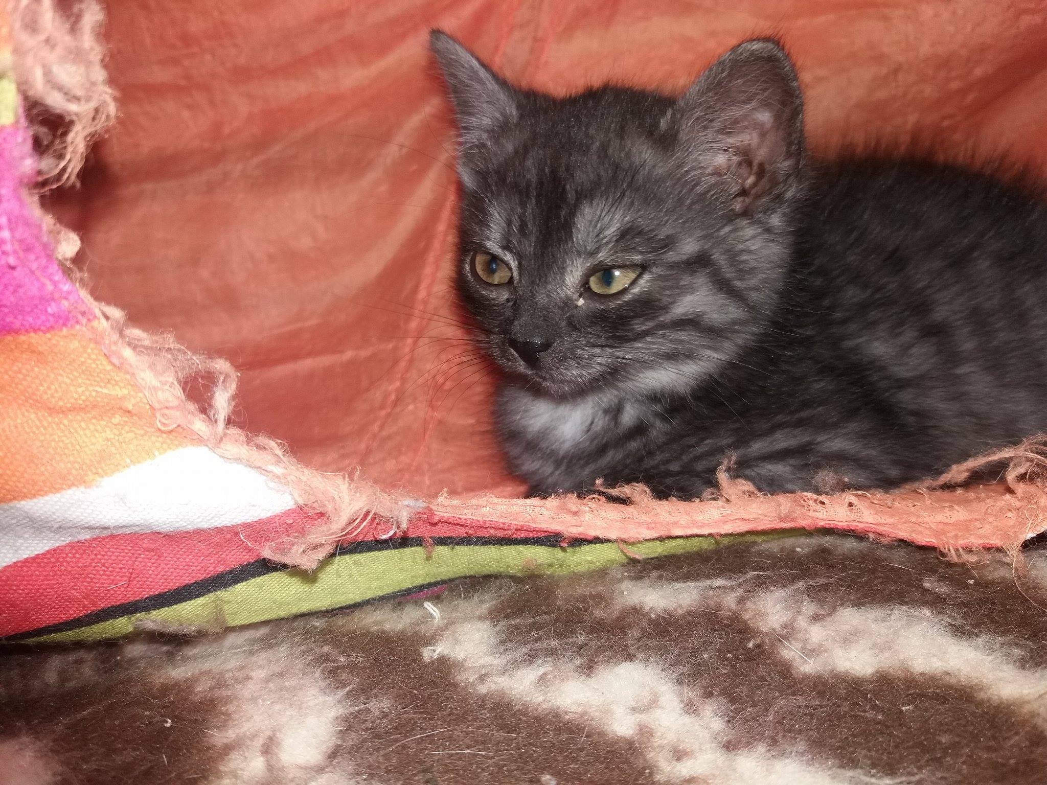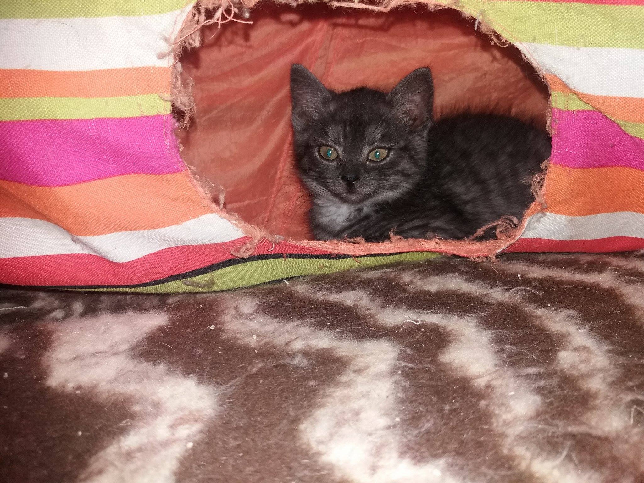 Úžasná kouřová potvůrka. Dovádí s ostatními koťaty, nebude to dlouho trvat a bude moc odejít domů. Hezky papá, chodí na záchod.