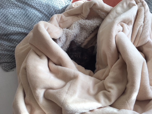 Kulicka se postupne zabydluje. Sice se porad schovava, ale v pohode se necha chytit, vydrzi v naruci, trosku i papa a v noci spi v posteli a snazi se byt nablizku. Jednou curala, sice na boty a ne do zachudku, ale to se taky spravi.
