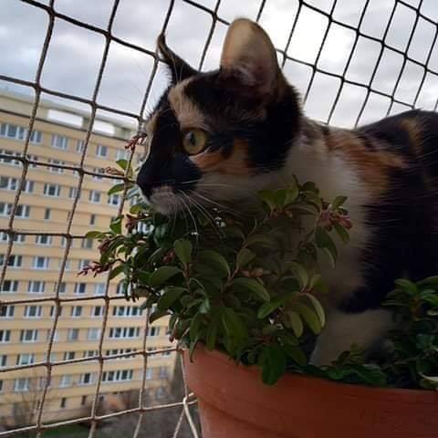 Charlie tráví mnoho času na balkoně, miluje ten čas, kdy tam může být a devastovat Lukášovz brusinku, z které si udělala posed (kterou už Lukáš musel v lednu znovu zasadit a přivázat, protože ji shodila) a z ní pozoruje nejspíš holuby, které tam kolem pořád lítají. Nenapadá nás, co jiného by jí tak moc zajímalo, na co zajímavého by mohla z devátého patra koukat. Ze všech bylinek prostě miluje jen a jen tu brusinku 😀…..
