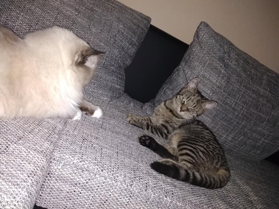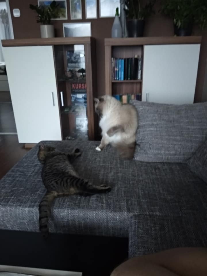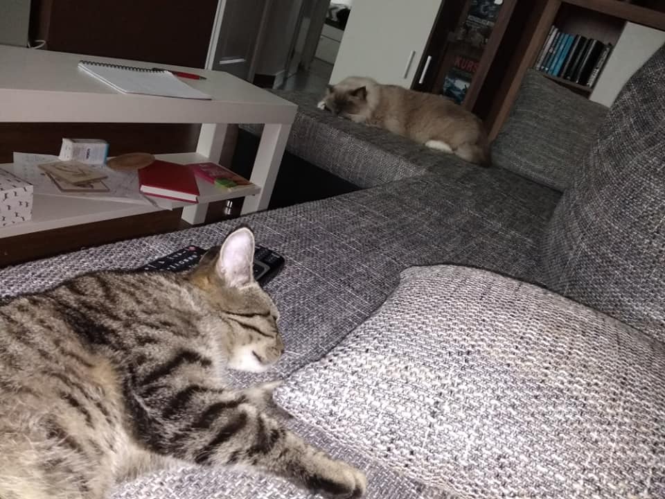 Soužití s Charliem budeme muset ještě dopilovat, ale vypadá to hodně nadějně. Roník se z přepravky vyhrnul jak velká voda, takže z něj byl Charlie trošku nervózní. Ze začátku na sebe kluci pěkně syčeli, včera se nám dokonce skoro porvali, ale oba se zlepšují a věříme, že to zvládnou. Dneska byla opravdu zábava je pozorovat, honili se tady z jedné strany bytu na druhou. Ani nevím, kdo koho víc provokuje. Teď oba spinkají. Dokonce chvilku leželi i pár centimetrů od sebe. Roník si pro sebe už včera zabral škrabadlo a spí na něm. Jsme rádi, protože tu konečně nestojí zbytečně, Charlie na něm ležet nemůže, je moc velký a těžký Budeme pořizovat velké a stabilní, aby na něm mohli být oba.