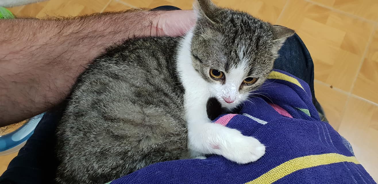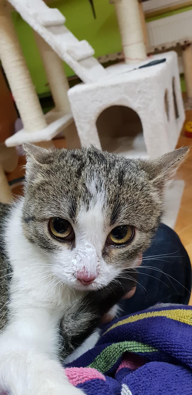 s poškozenou přední tlapkou. Potřebovala by mazlit a mazlit. Při podávání injekce 💉 předvedla histerickou scénku a pokousala vše co bylo v okolí 😃. Nakonec se k mazleni nechala přemluvit a mimo injekci jsme ji namazali i nosanek masti proti plísni ☀️