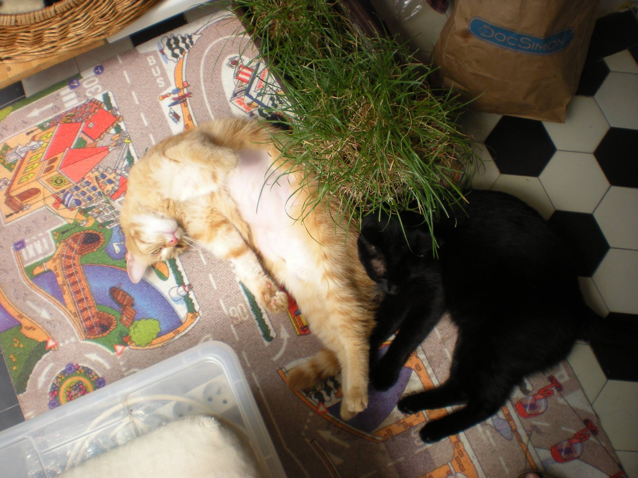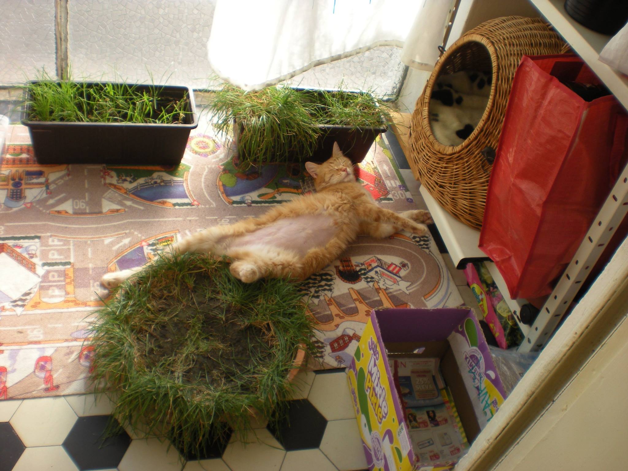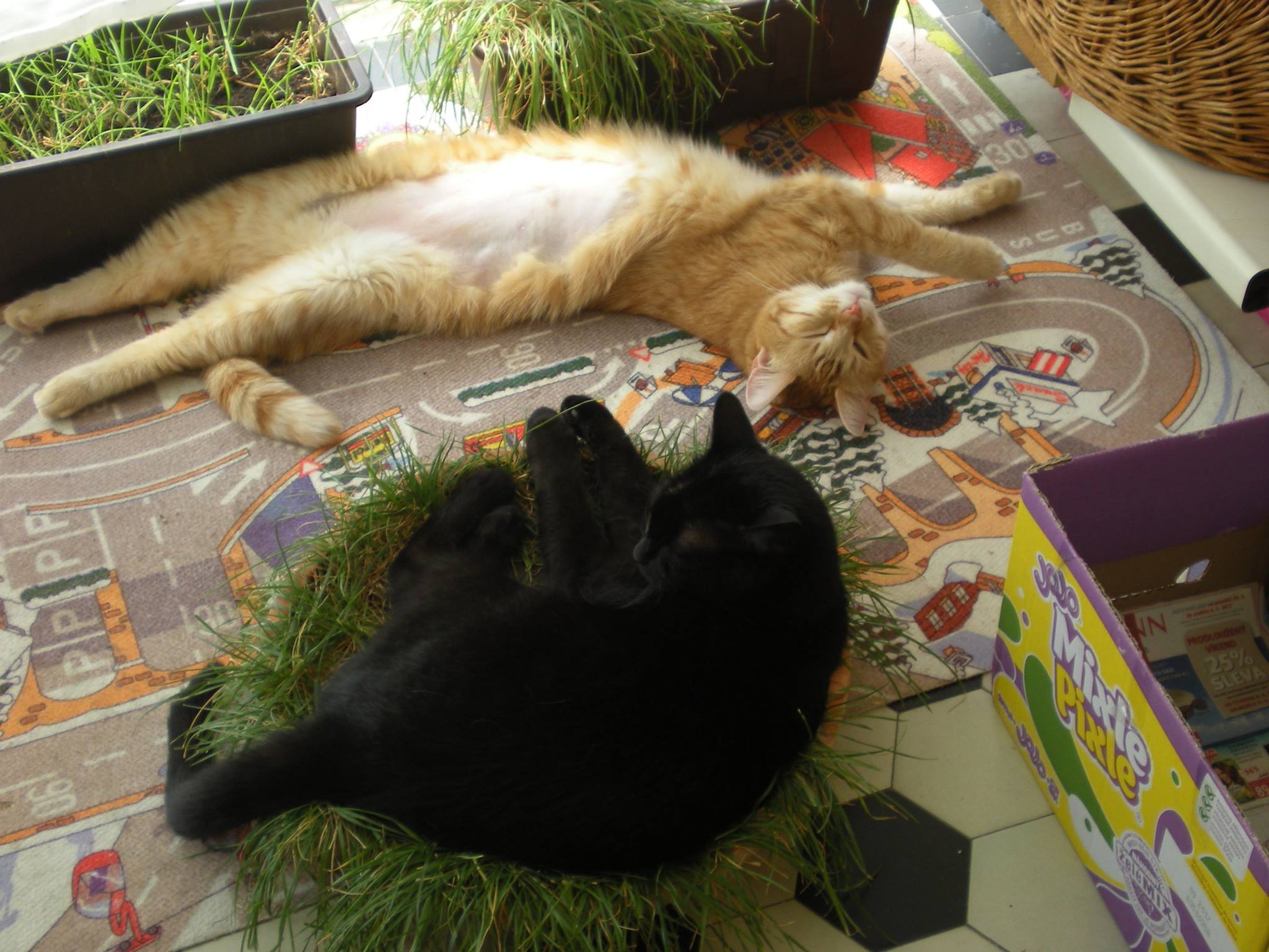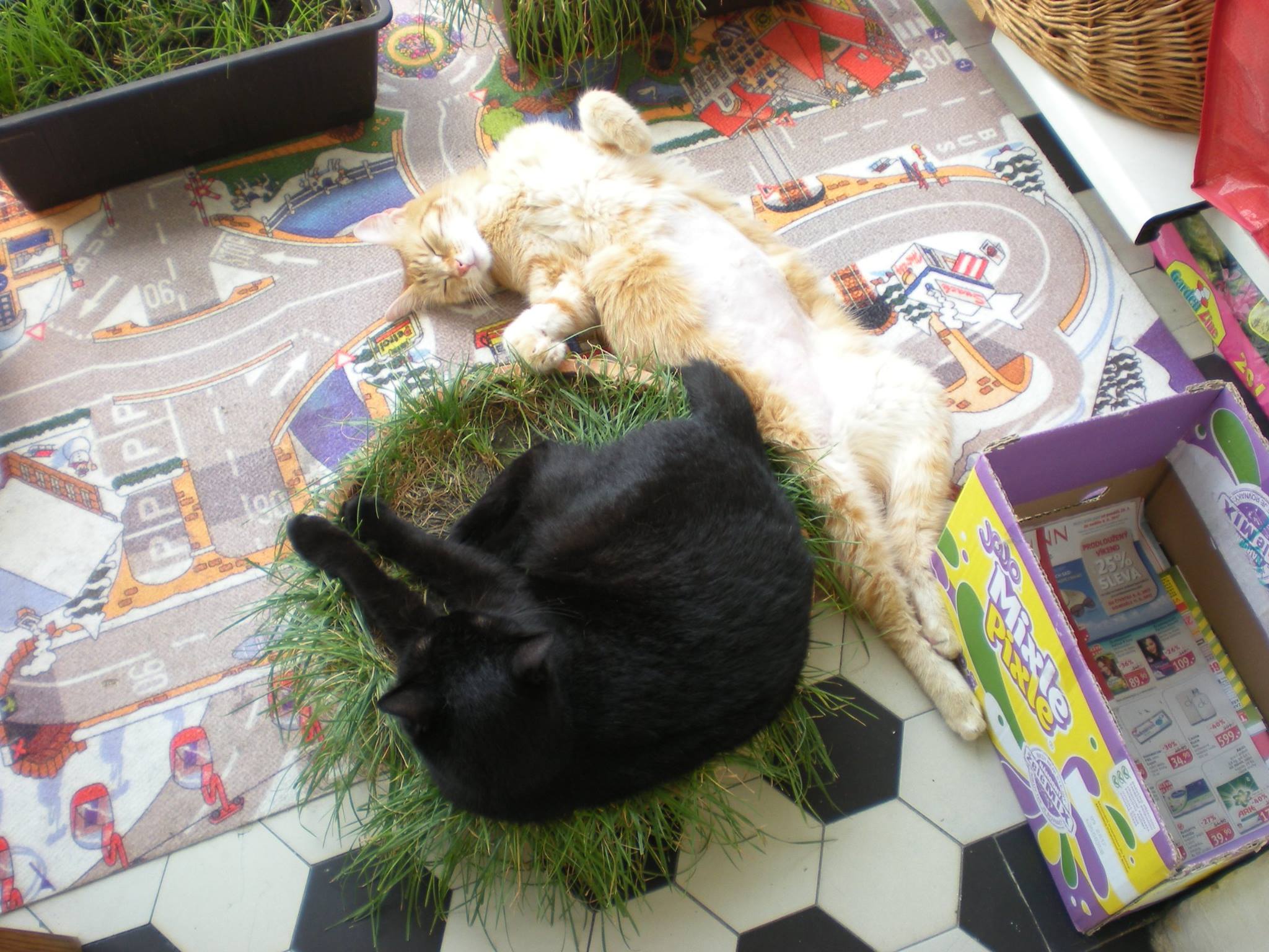tak výsledek testu na toxoplasmosu byl negativní, ale podle pana doktora se s ní Kubíček už někdy potkal. Takže závěr je ten, že to mohla být viroza, ale FIP nadále není vyloučena. Kubíček hlavně musí jíst a my ho máme sledovat. S jídlem je to trochu složité, protože nejí to, co dříve. Snažíme se mu dávat, co mu chutná, což jsou momentálně granule krůtí s rýží z drogerie DM (jiné nechce) a v tomto vedru zvlášť oblíbené kostičky přemraženého vychlazeného vepřového masa. Dál denně dostává Imunoglukan a oblíbil si snacky a pamlsky od Vitakraftu. Zatím si drží váhu, za poslední týden přibral 5 dkg, takže má 3,75 kg. Současné tropické počasí tráví s Elou na balkoně – viz připojené fotky z dneška.