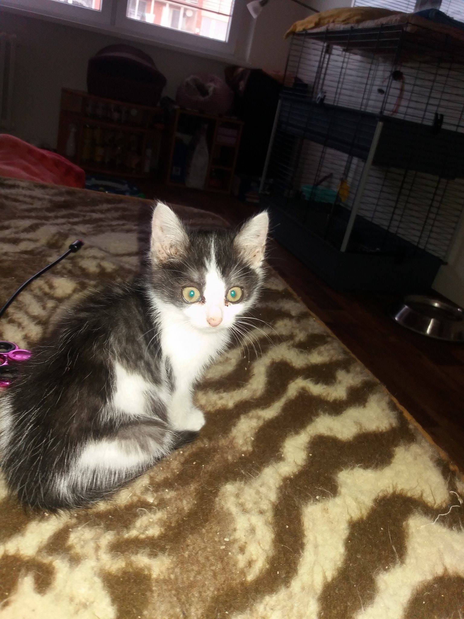 Kočička je hezounká, hodně papá, mazlení se ji začíná líbit. Je hodně akční, pořád honí hračky a miluje všelijaká mávátka a já si s ní musím hrát. Myslím, že může odejít do nového domova.