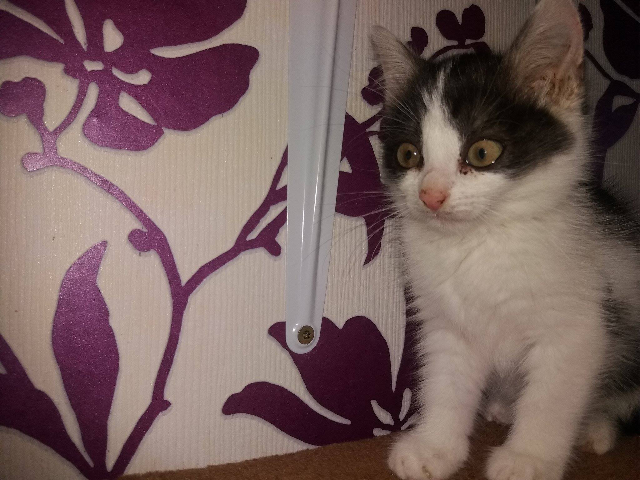Černobílá kočička, která byla spolu se svými sourozenci Kouličkou, Válečkem a Kroužkem nalezena ve Vlastislavi, na půdě rodičů Milana.