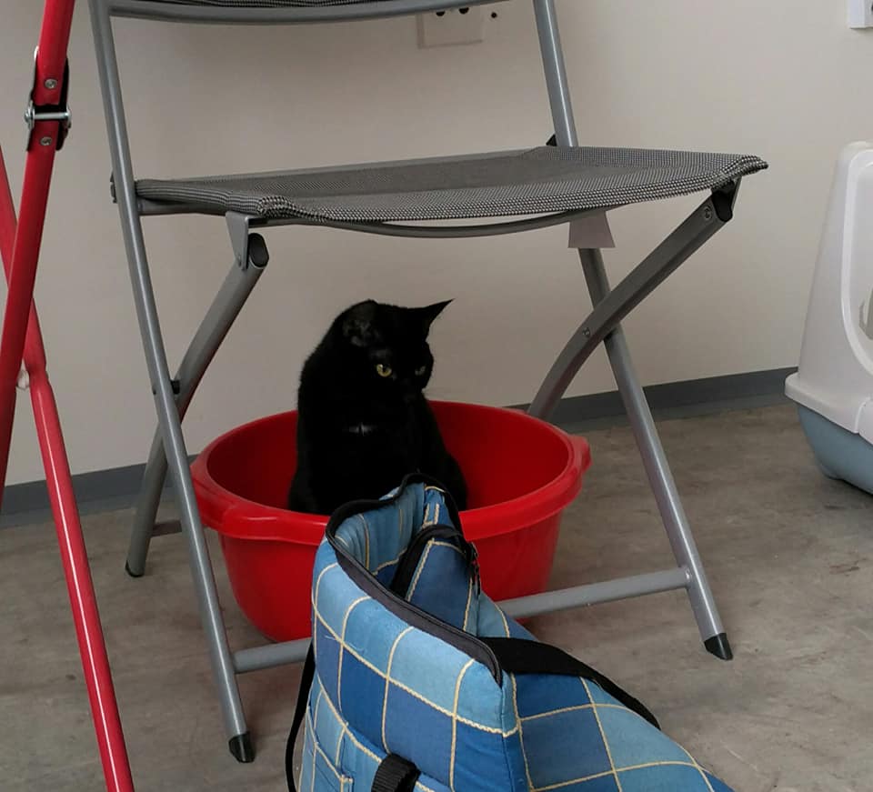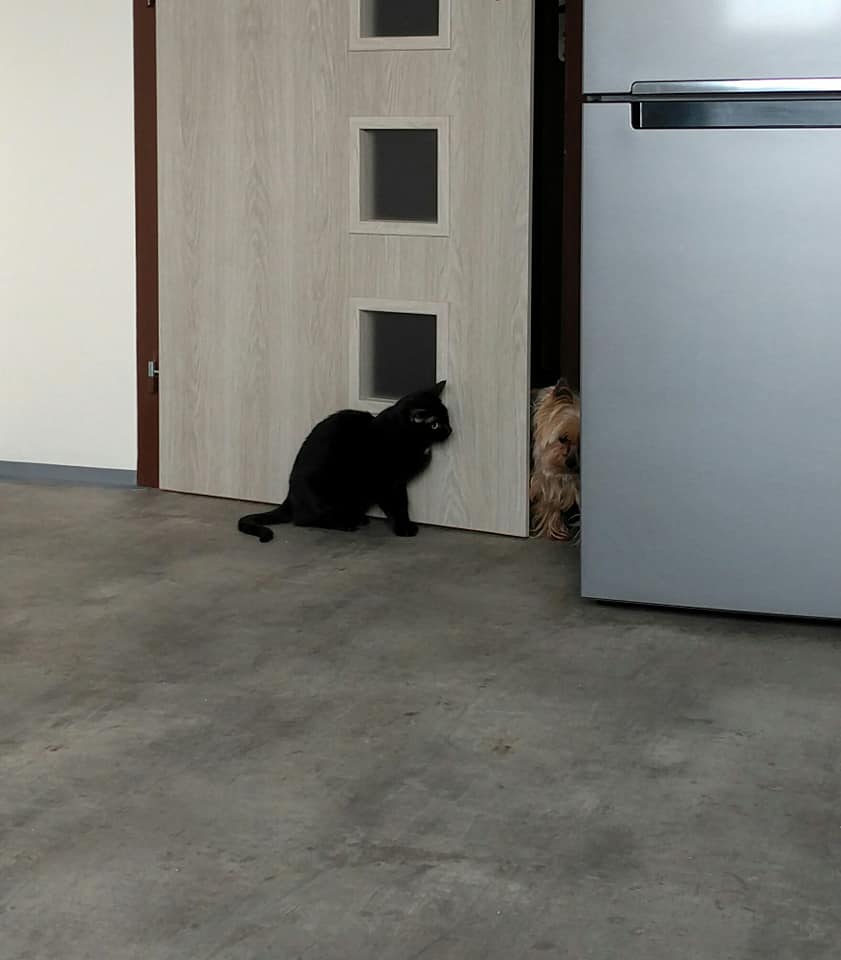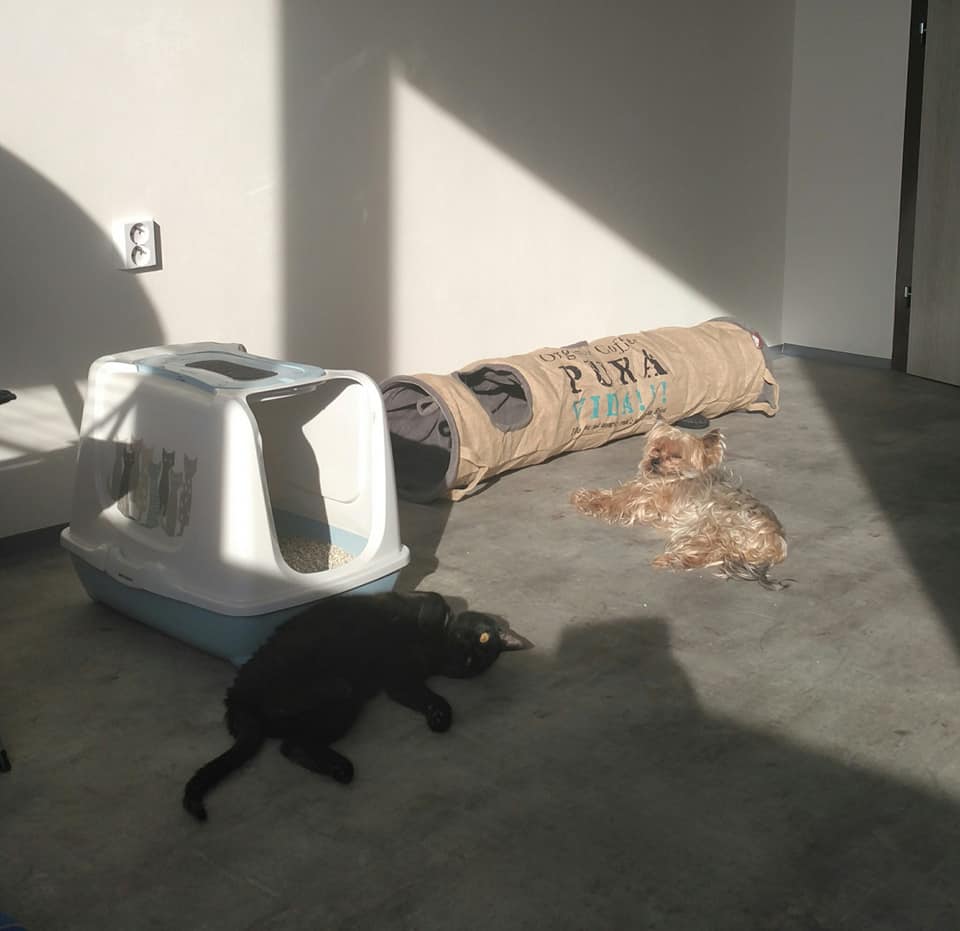 tak se mi nakonec podařilo udělat pár fotek, Maggie už si sama hraje, vrní, rozvaluje se a velmi hlasitě se dožaduje papání… To všechno jenom dokud ji nechci pohladit, sáhnout na sebe nenechá, ale minimálně se Sindy (jorkšír) se kamarádit chce, na tu pořád číhá za dveřmi (viz jedna z fotek), otírá se o ni a hlídá ji, i když je ještě opatrná.