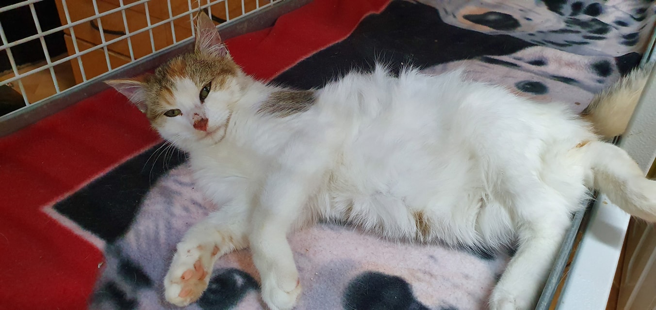 🔸… si po včerejším příjmu užívá tepla a jídla. Dnes si i chvíli hrála v kleci s hračkou. Zatím je však slabá, stále spí, moc se nedokáže postavit a vydržet na zadních nohou. Kuli zdravotnímu stavu nemohla být zatím ani naočkována.