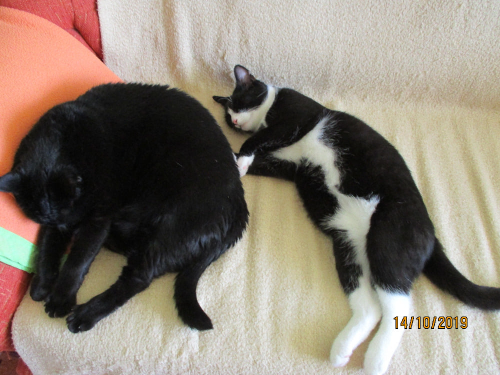 Černá Julča /9let/ ho přijala a často spí spolu na gauči.