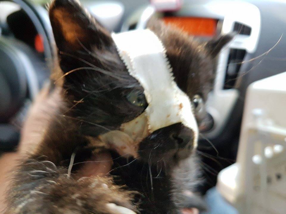 Miminko Lupínek od školy v Roudnici n.L.. Chudinka musí mít zafixovanou pusinku, aby v budoucnu neměl problémy s jídlem, aby zlomená čelist dobře srostla. Vzhledem k věku a váze nebylo možné tlamičku jinak zafixovat.
