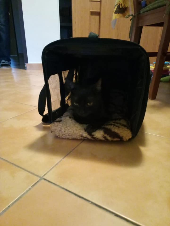 Bueno zvladl cestu autem úplně bravurně skoro celou cestu jsme o něm nevěděli, teprve v posledních pěti minutách si vzpomněl, že už ho přepravka nudí a tak si 3krat zamňoukal.
