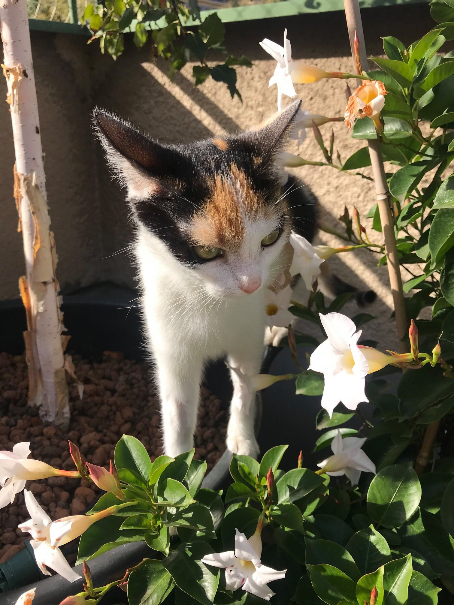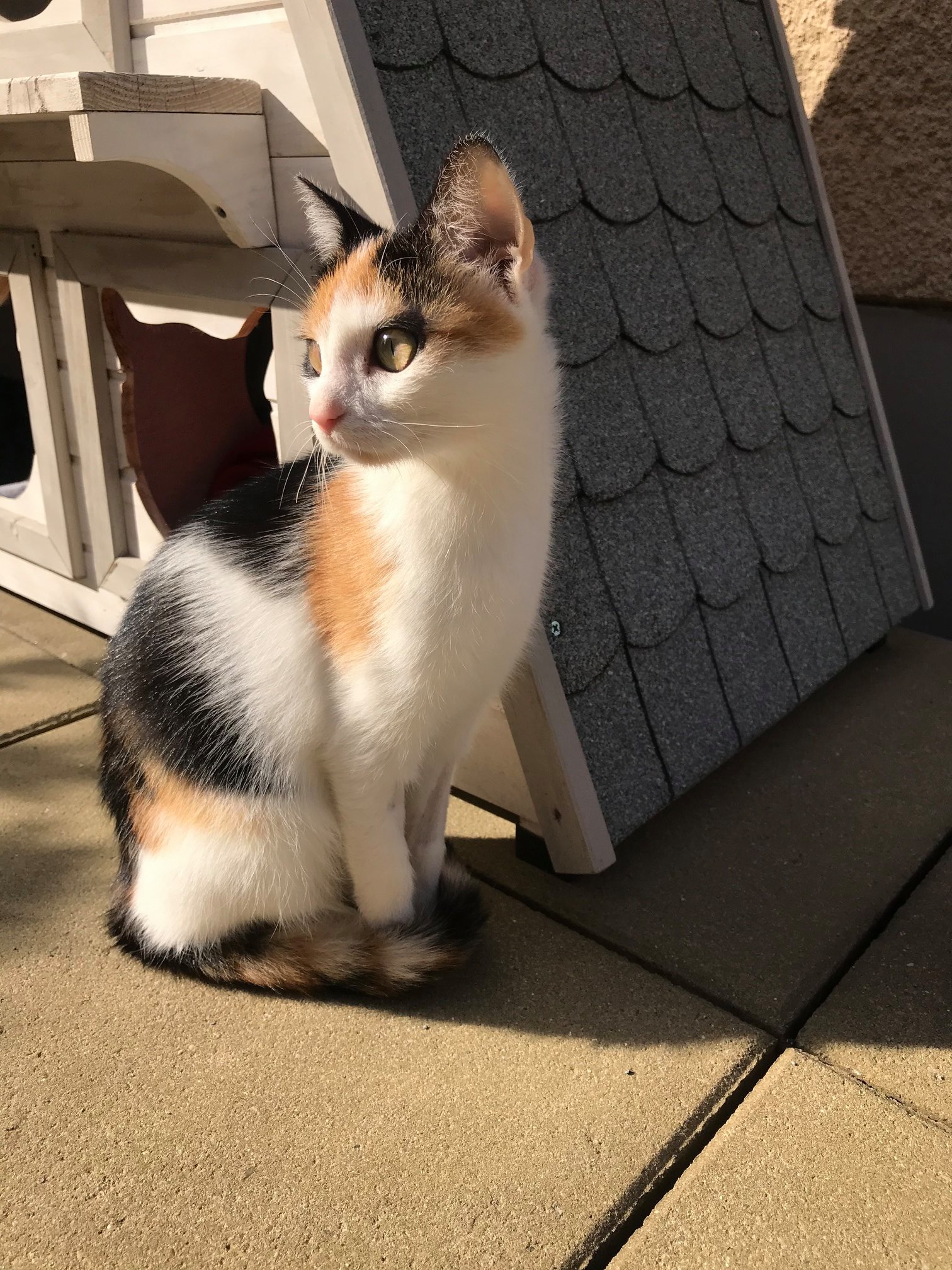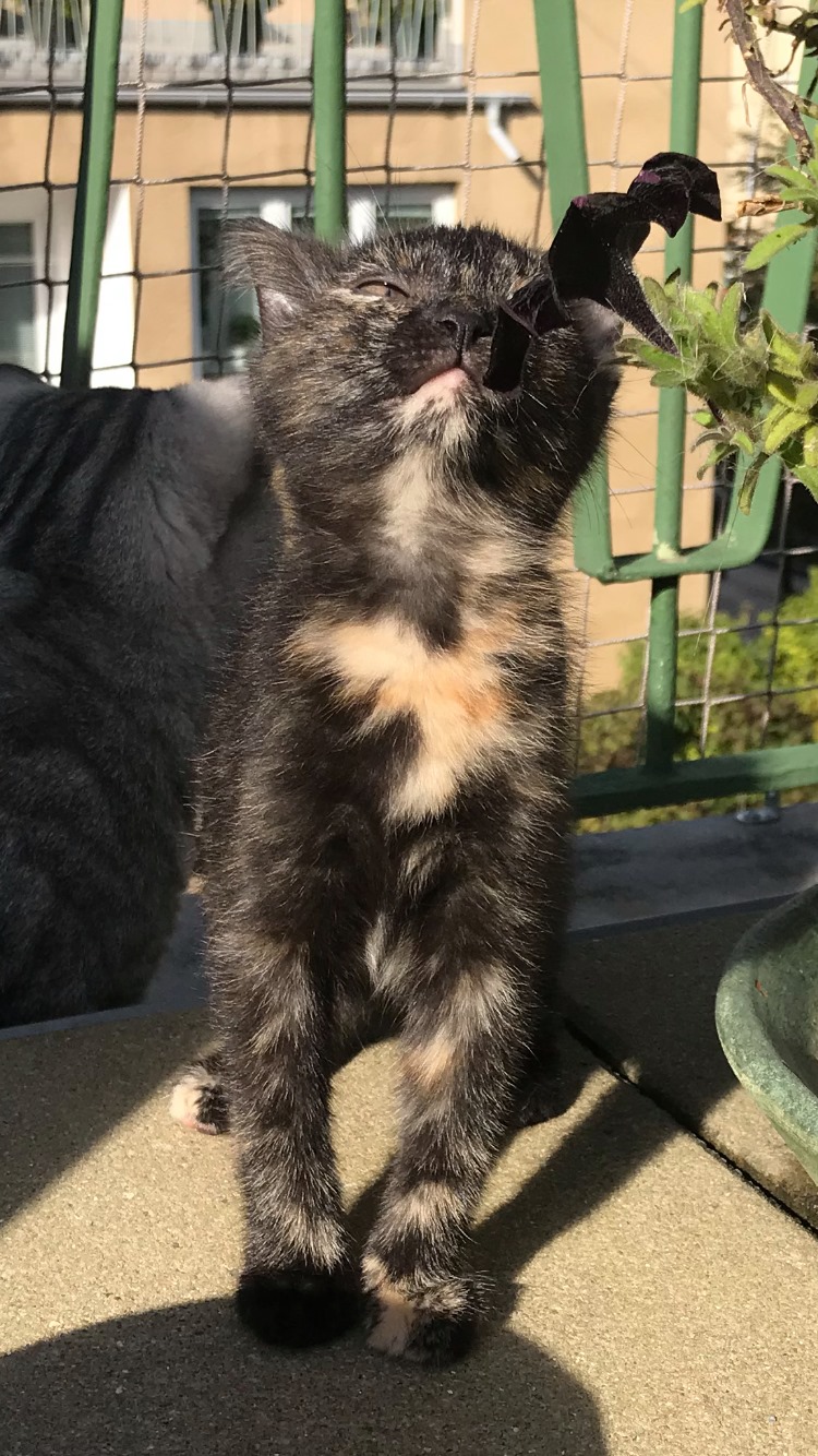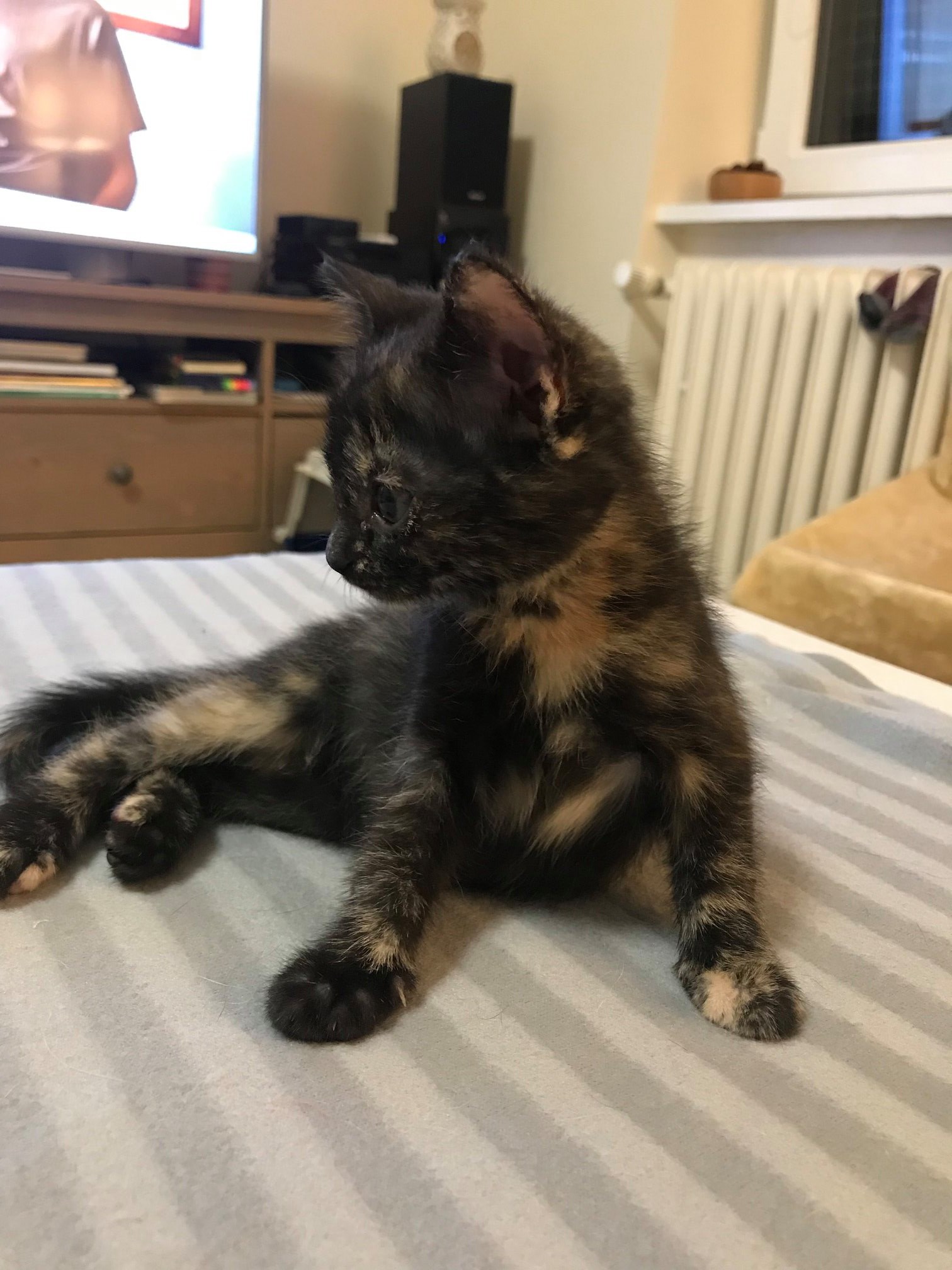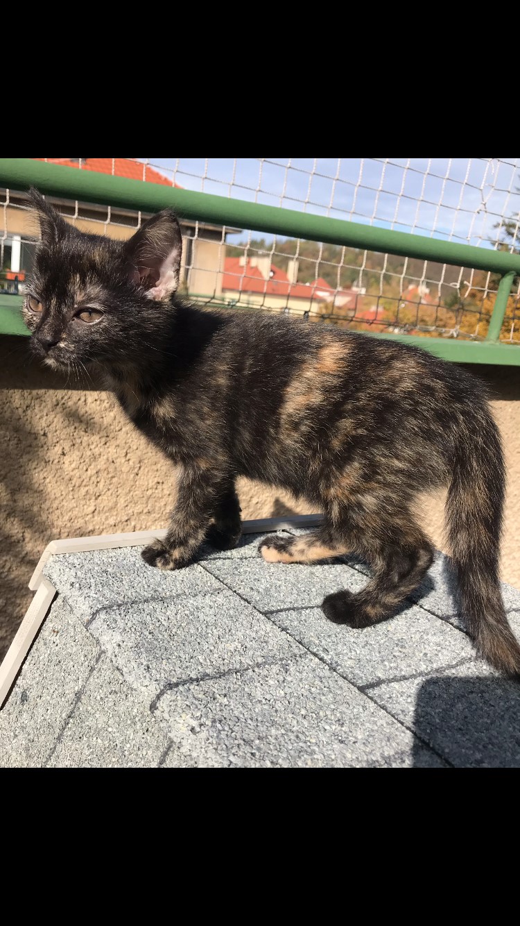 Nádherná želvovinová kočička. Když byla, společně se svou maminkou a třemi sestřičkami, nalezena v opuštěném domě na Praze 4, byla ze všech tou nejmenší Jestli je něčím výjimečná, tak tou svou naprosto dokonalou nemotorností, která z ní dělá to nejsladší a nejroztomilejší stvoření. Teď už je to samostatná kočička, která objevuje svět všemožnými hrami. Stejně jako její maminka má velmi zajímavý podlouhlý nosánek a pokud bude mít, stejně jako maminka, tak krásně zelené oči, tak z ní vyroste naprosto nevšední kočičí dáma.