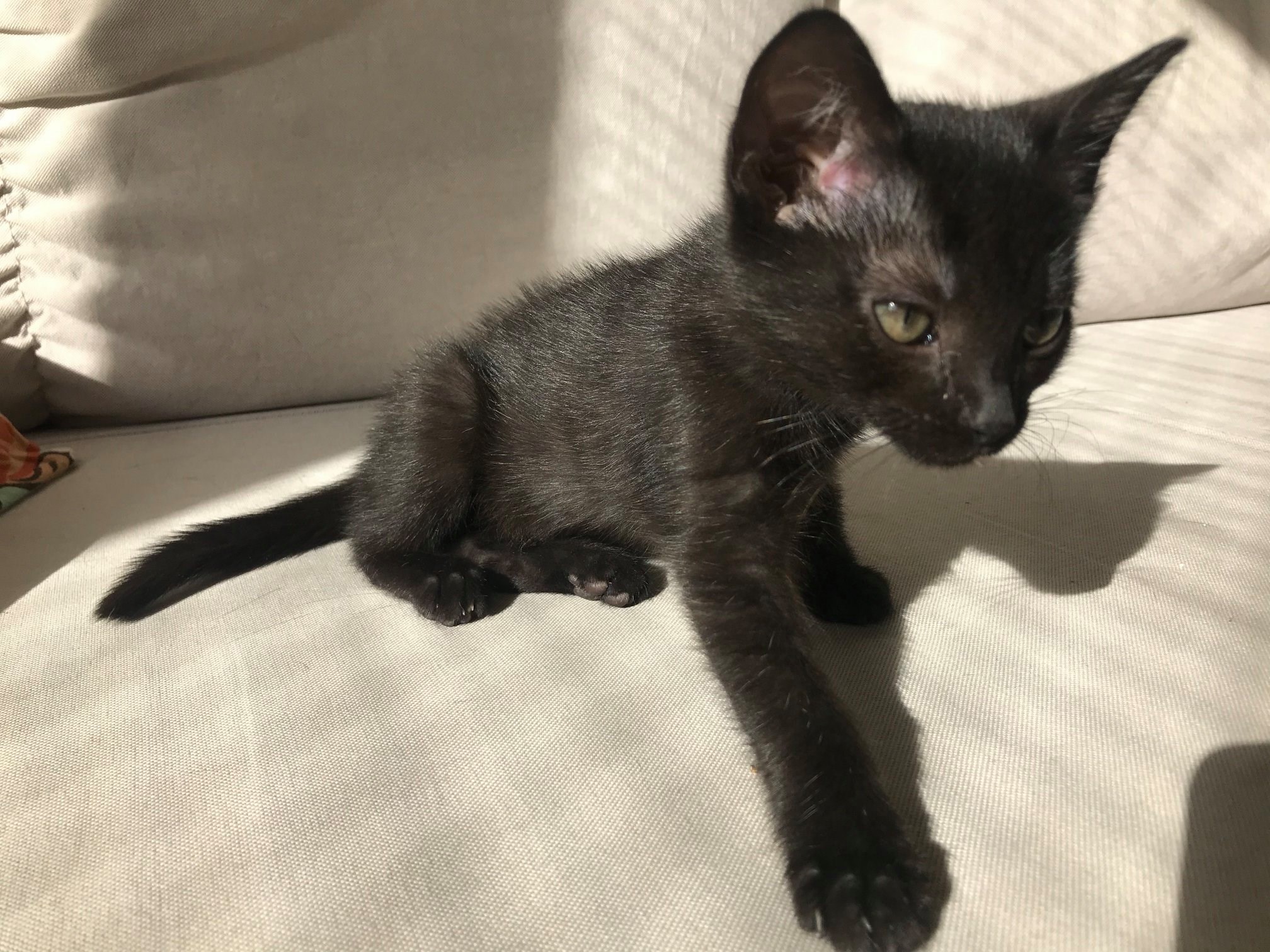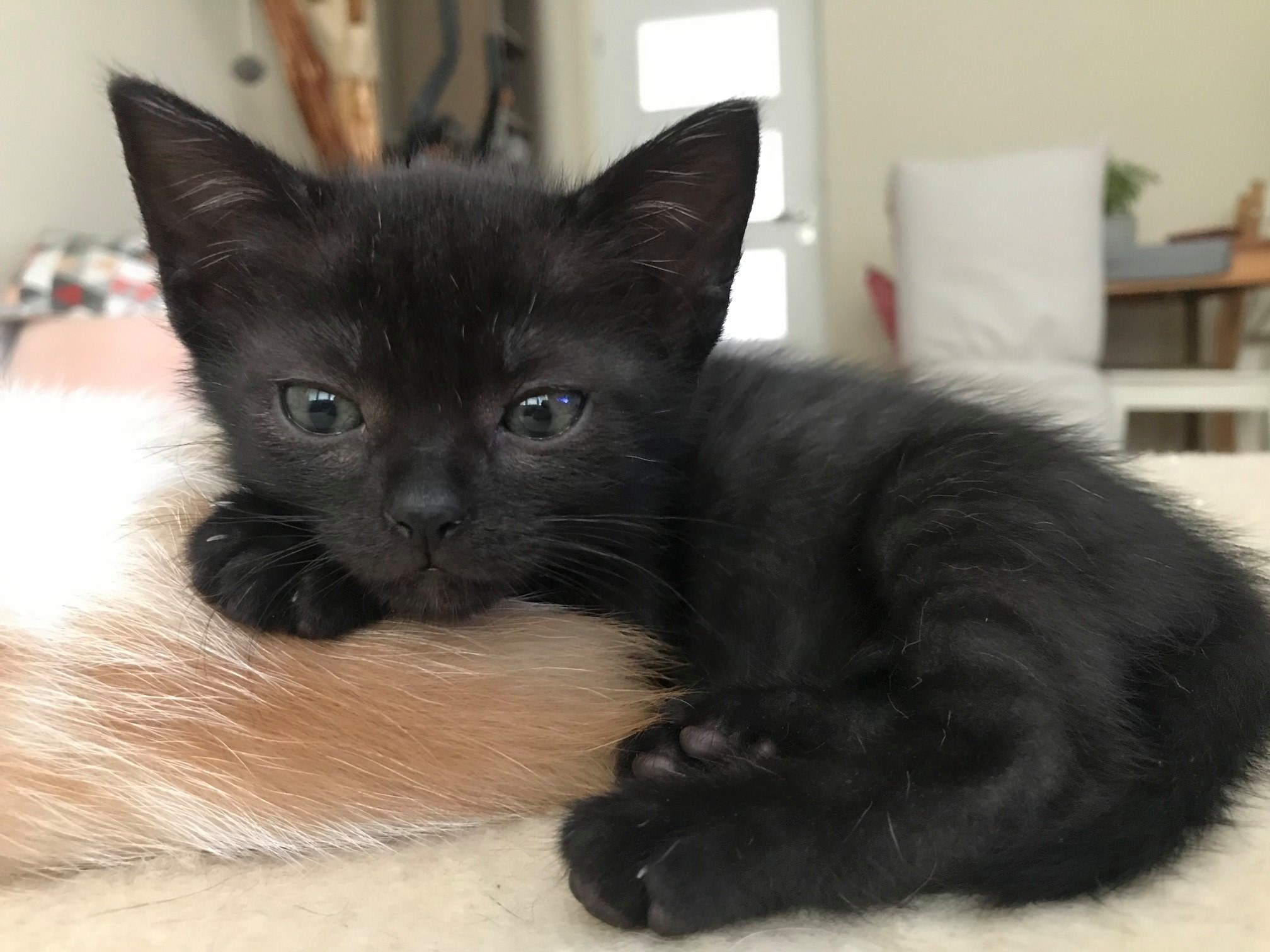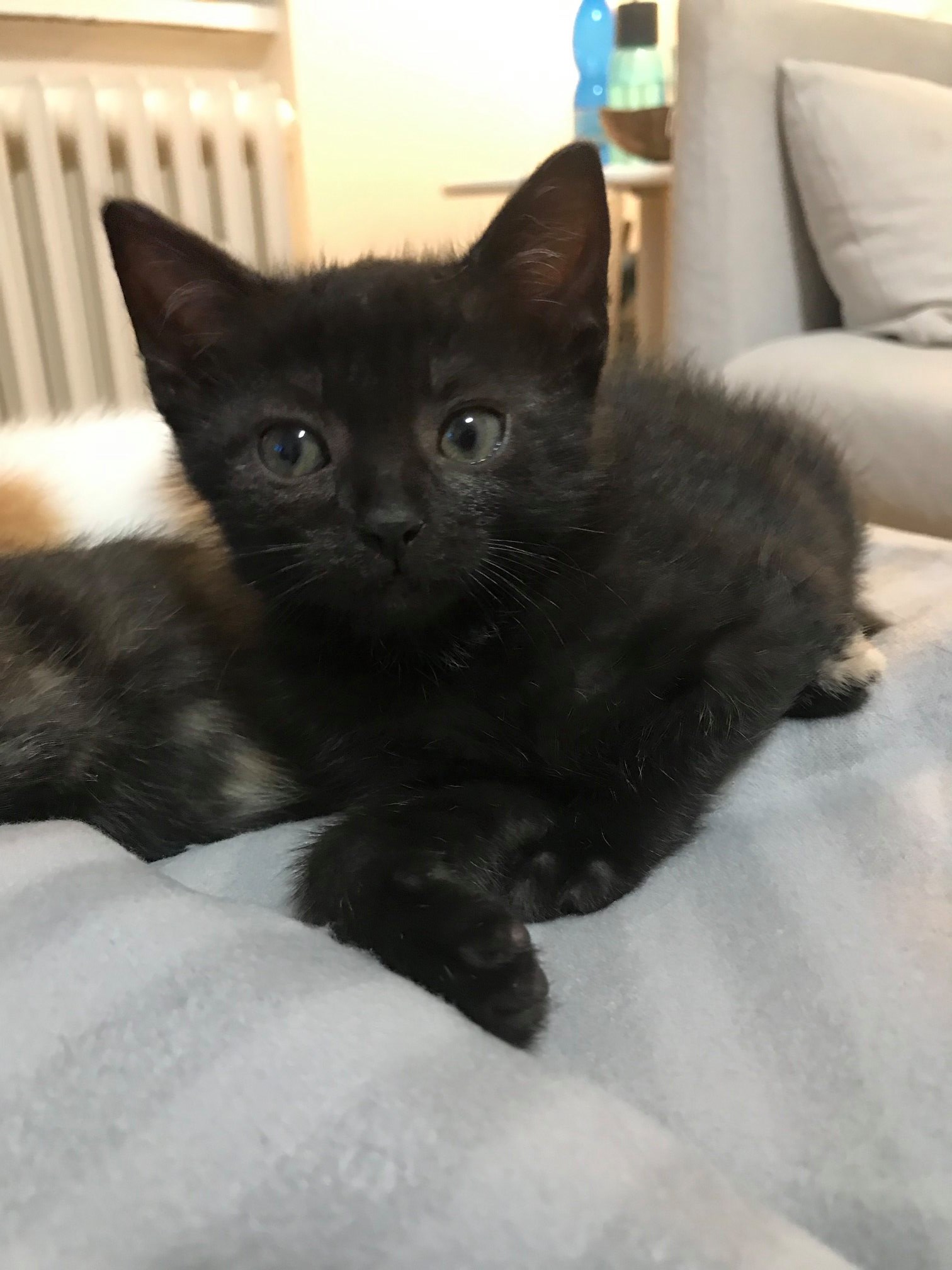 Černá kočičí holčička, která byla nalezena, v opuštěném domě na Praze 4, se svými třemi sestřičkami a maminkou. Je to ještě malé prtě, které vyžaduje blízkost buď své maminky nebo člověka. Lidí se vůbec nebojí, ráda vedle nich usíná. Je to taková něžná hravá kočička, co bude mít na 90% krásná zelená očička (po mamince).