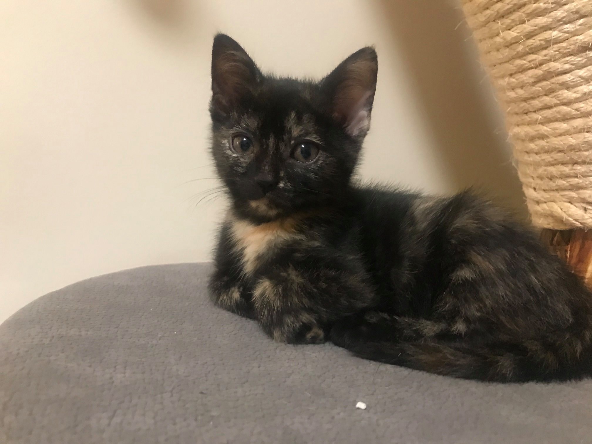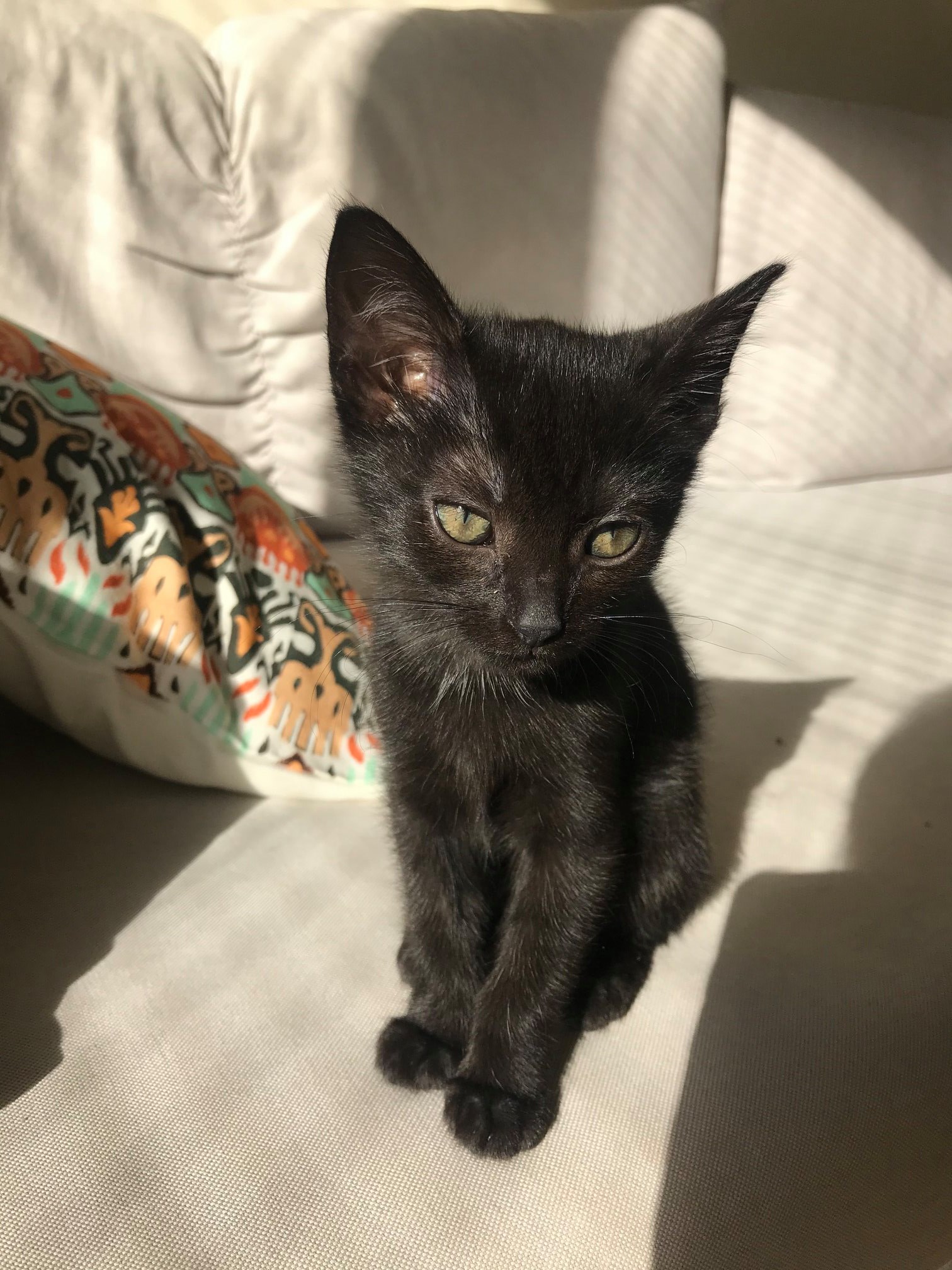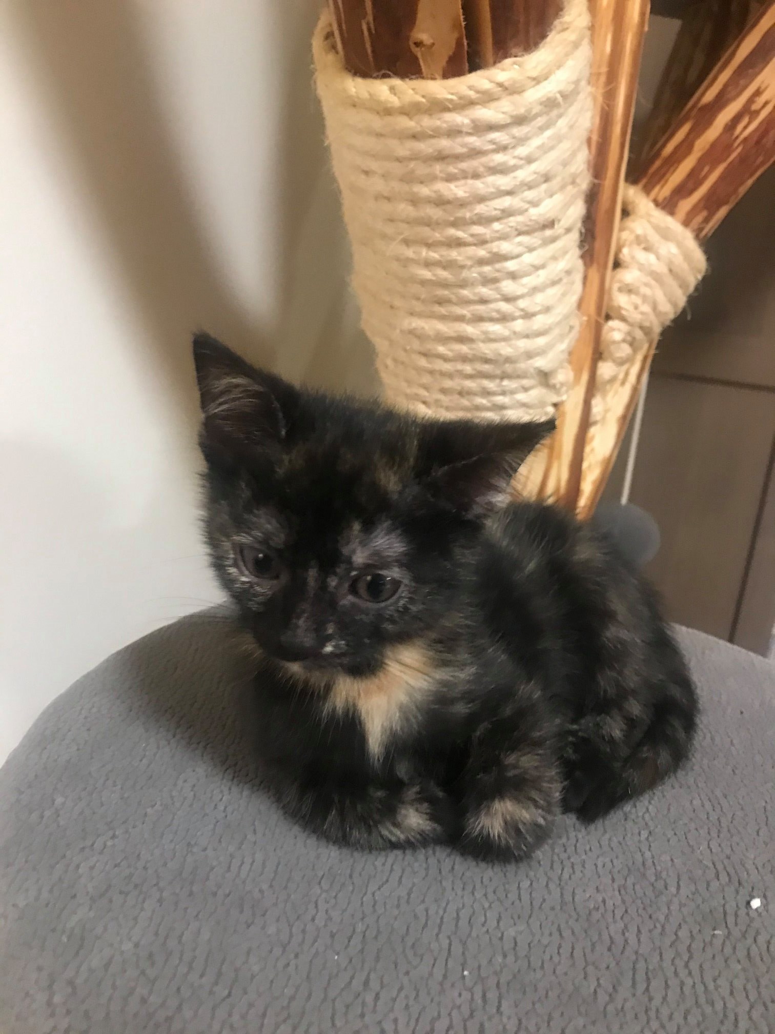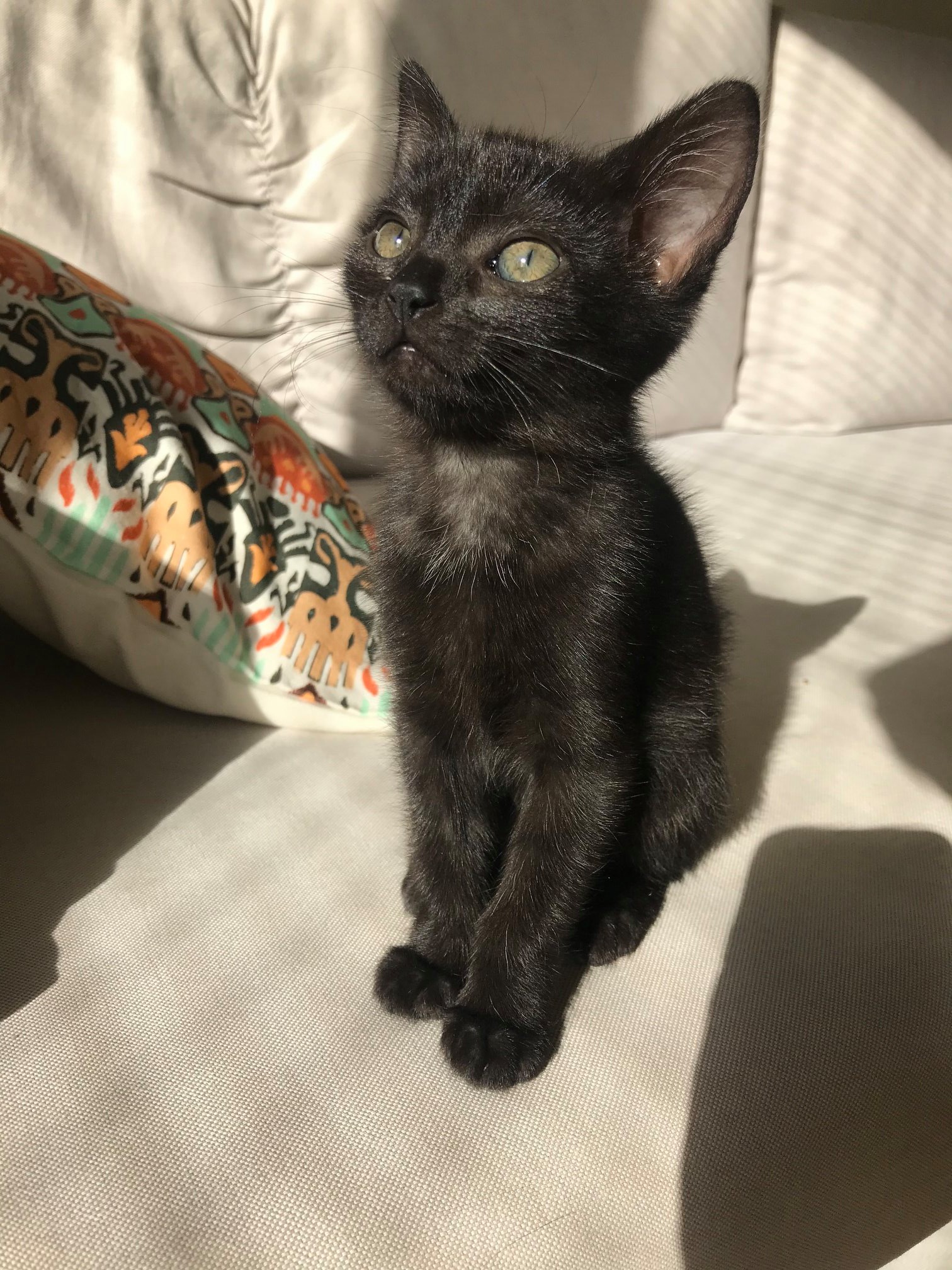 Černá kočičí holčička, která byla nalezena, v opuštěném domě na Praze 4, se svými třemi sestřičkami a maminkou. Je to ještě malé prtě, které vyžaduje blízkost buď své maminky nebo člověka. Lidí se vůbec nebojí, ráda vedle nich usíná. Je to taková něžná hravá kočička, co bude mít na 90% krásná zelená očička (po mamince).