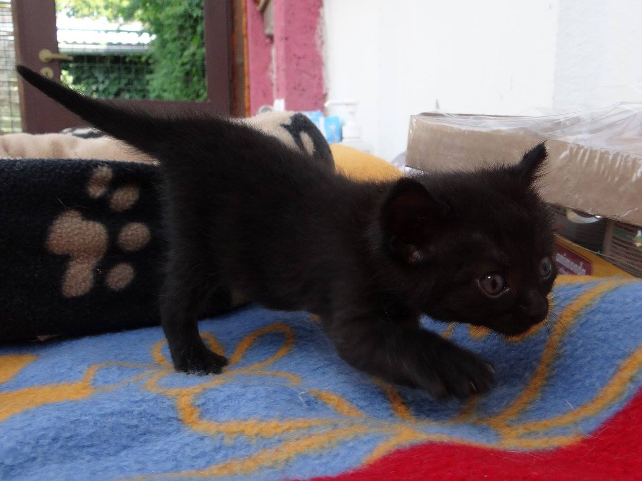 Černý kocourek, který dva dny plakal pod hromadou stavebního materiálu u fotbalového hřiště v Roudnici n.L. v Podluskách. Objevili hodní lidé, které pláč koťátka nenechával lhostejným. Vypadá zdravě a tak ho dostala do opatrování kočička Tulinka. Chlapeček se okamžitě přisál k nové mamince a při krmení kapsičkou se vrhl celým tělem i na tuhé jídlo. Ve voliéře s maminkami je tam nejmenším kotětem, váží 257 gramů, ale moc šikovný.